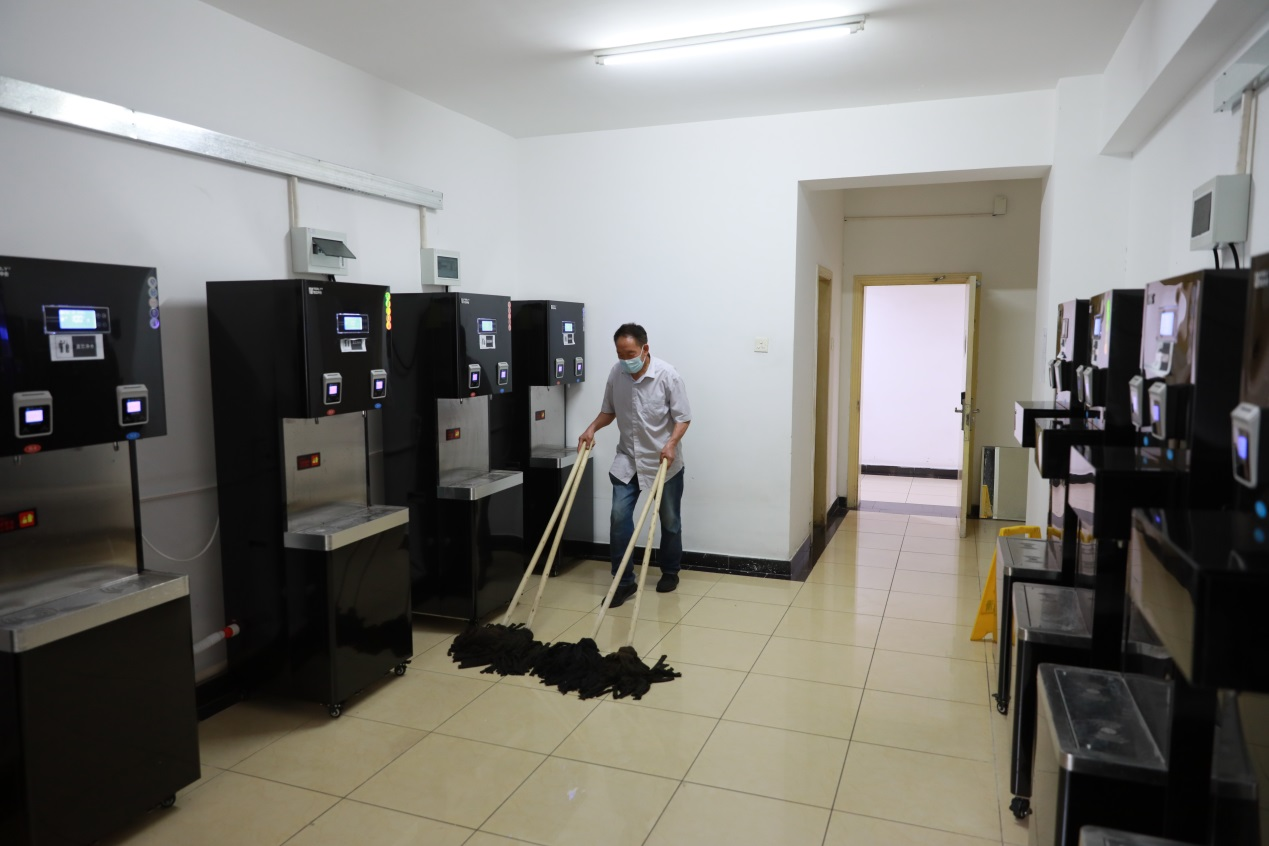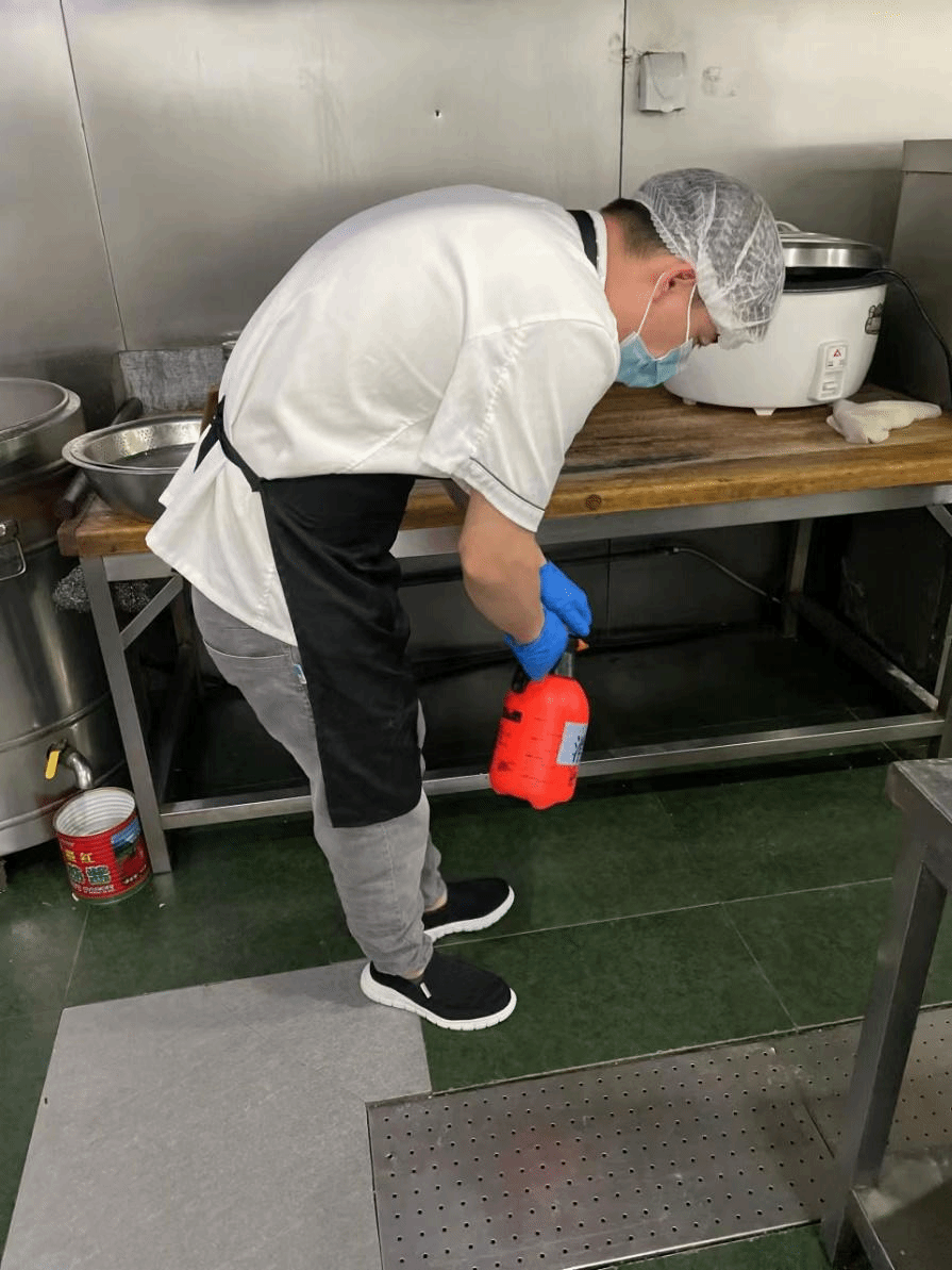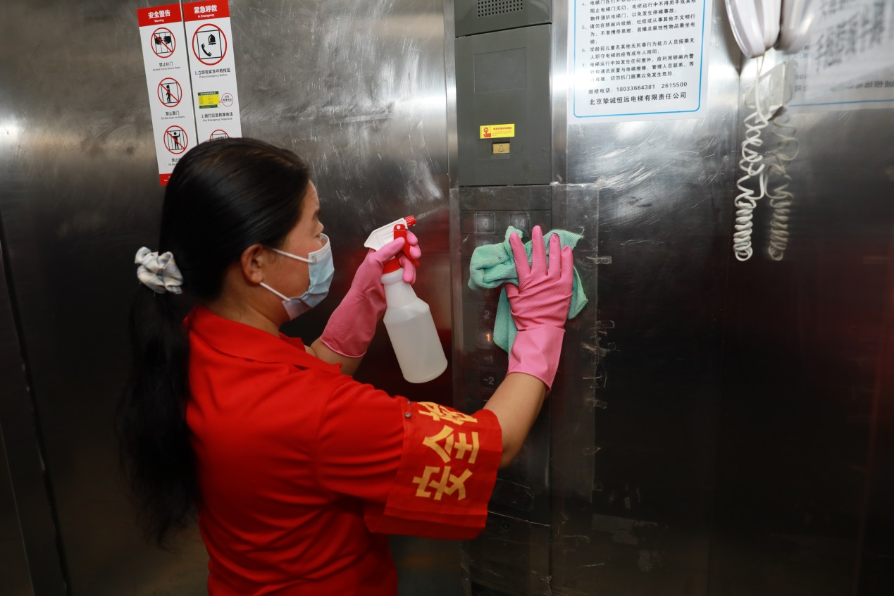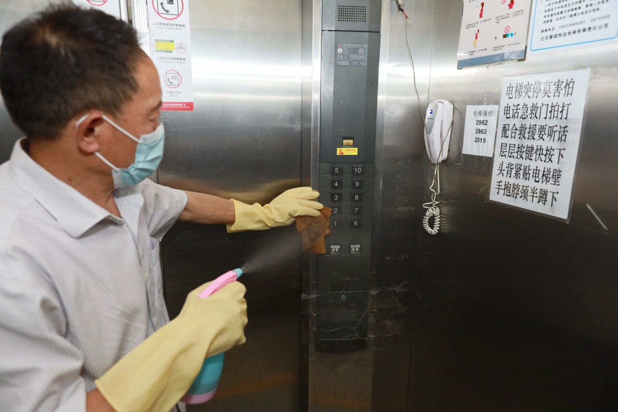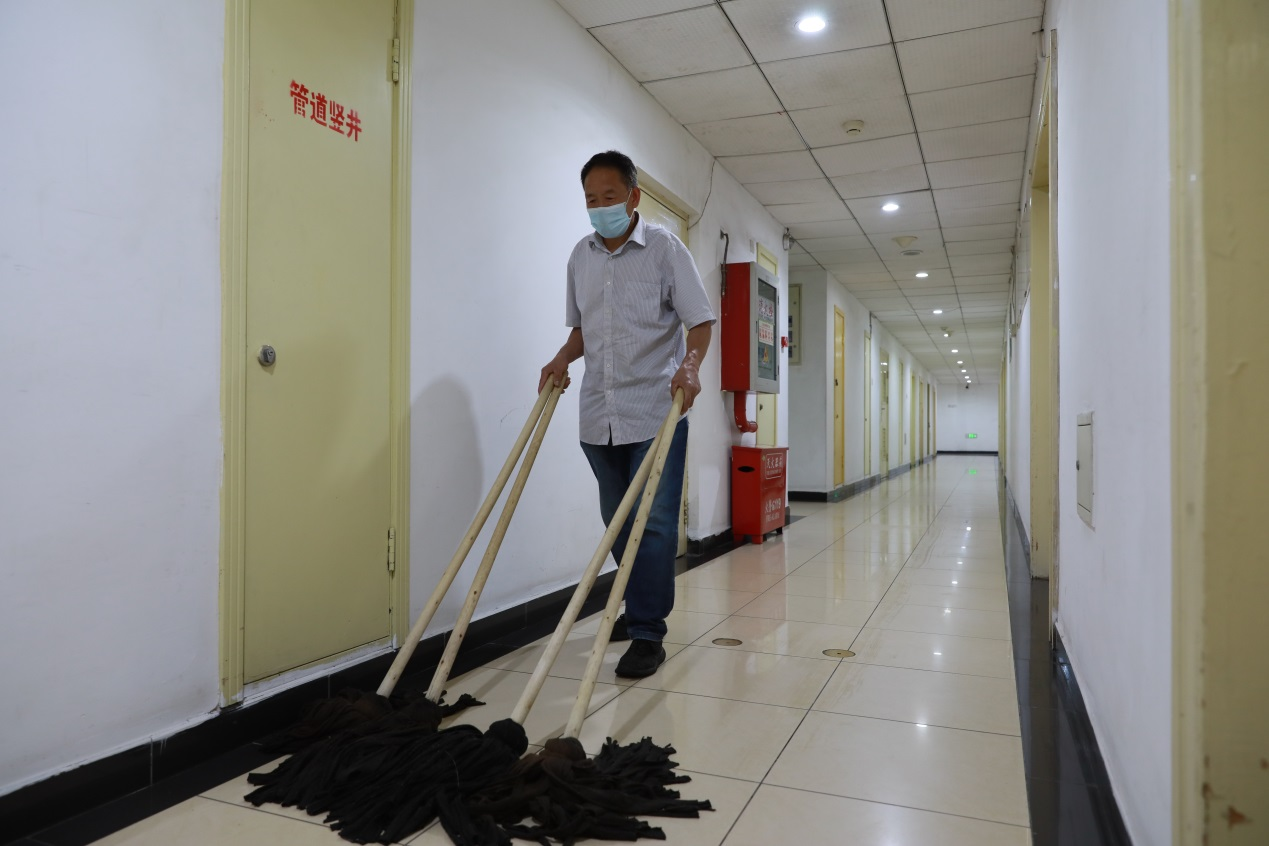 ▲学生4号公寓的保洁员在各个区域进行消杀工作