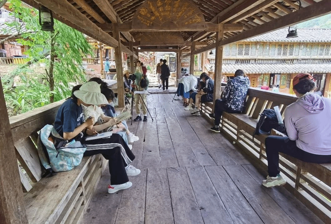 潘一见、曹巍等老师带领2021级国画专业学生赴贵州黔东南郎德苗寨,考察苗族、侗族文化与风俗习惯,并开展写生教学实践。