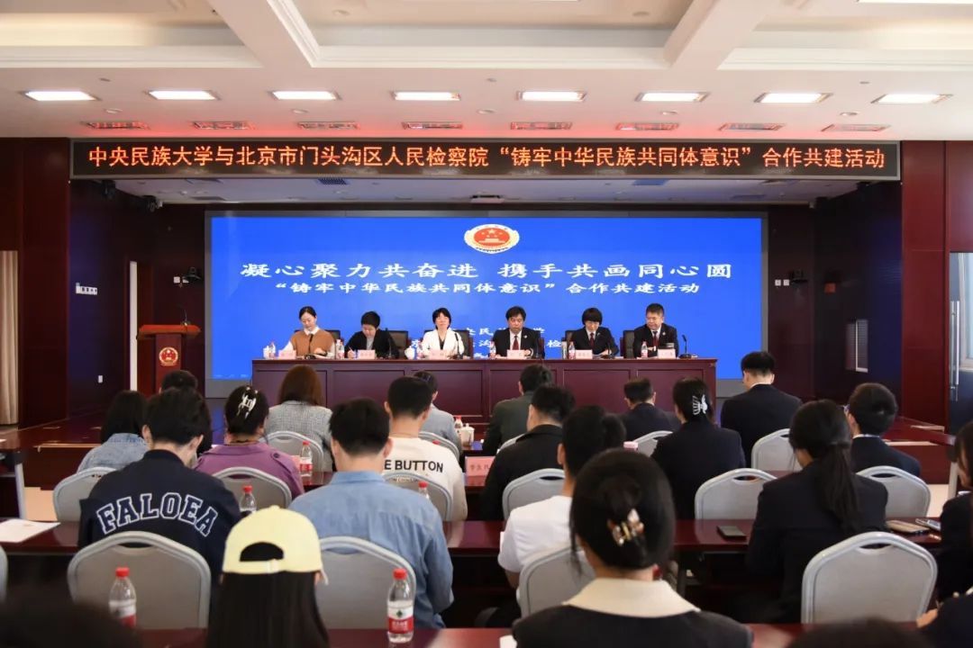 新闻网讯 为加强检校合作、融合发展,搭建优质教学实践平台,有形、有感、有效开展铸牢中华民族共同体意识教育,推动学校教学水平高质量发展,4月16日上午,学校法学院与北京市门头沟区人民检察院开展“铸牢中华民族共同体意识”合作共建活动,举办铸牢中华民族共同体意识教育实践基地揭牌仪式。门头沟区人民检察院党组副书记、副检察长石磊,党组成员、第五检察部主任滕英杰,检委会专职委员王久海、团总支书记辛国强等领导班子成员、部门负责人、青年干警代表以及william威廉中文官网团委书记薛冬雪,法学院党委书记邓群、党委副书记杨怡等师生代表共计50余人参加活动。