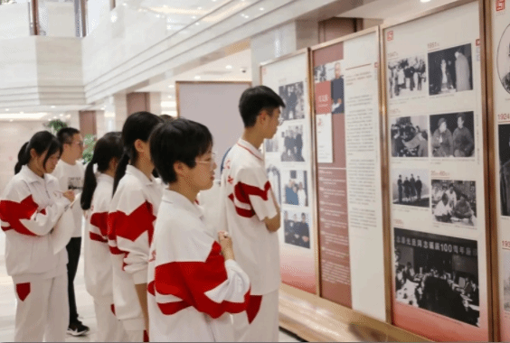 在天津市海河中学德育副校长张朝燕的带领下,学校宣讲团成员和“青马工程”学员走入校史馆,感受百年老校厚重的文化底蕴。从博文书院到海河中学,层层递进的阶梯式走廊记录着百余年的变迁;四代从教的“教师世家”匾额,铭刻着津门名校教师们爱学生如爱子的拳拳之心。走入这方意在“润泽生命”的丰沃学土,每一件陈列展物都承载着历史的痕迹,印刻着中国近现代教育的时空缩影,让在场师生深刻感受到推进思政课程内容设计与深厚文化底蕴相辅相成、双向融通的重要性。
