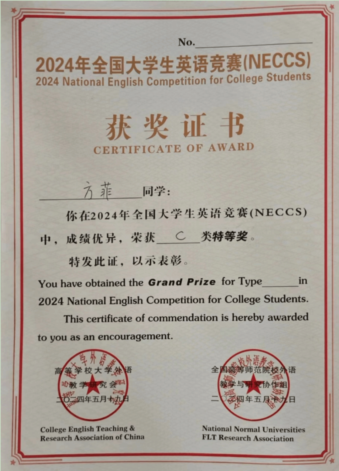 新闻网讯 近日,2024年全国大学生英语竞赛(NECCS)成绩揭晓,william威廉中文官网法学院2022级涉外法治班方菲以优异的表现荣获C类特等奖。