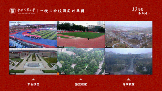 第二块大屏则对接了学校海淀、丰台、海南三个校区不同区域的实时视频信号,能实时观看校园全景和迎新现场情况,通过画面的隔空投送,让MUCer“身临其境”线上漫游三校区。