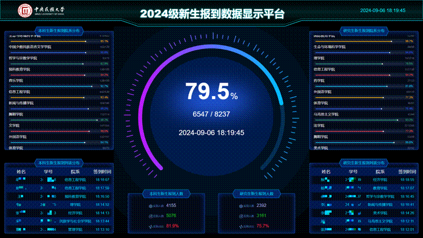 第一块大屏将全校新生报到的实时数据以多个维度和多种方式进行统计分析展示,使迎新工作整体数据的呈现更加直观和立体,迎新数据的可视化,不仅便于学校和各院系及时了解新生报到趋势和总体进度,也为统筹和决策提供了可靠的支撑。