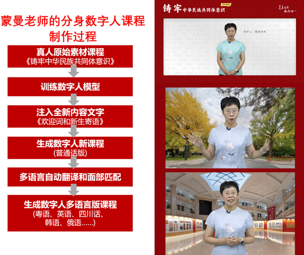 此次向大家展示的是学校蒙曼教授的数字人课程,在现场,蒙曼教授的数字人用六种语言向大家生动讲授着《铸牢中华民族共同体意识》课程。