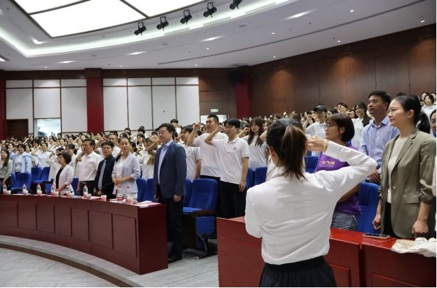 随后,与会领导向各班新生代表赠予校徽,吴泽庆为新生代表授院旗,旗帜高高飘扬,彰显着新时代外语人的责任担当全体新生庄严宣誓,立志秉承“美美与共、知行合一”的民大校训,弘扬开放包容、传承创新的外院精神,为民族团结进步和中华民族伟大复兴贡献青春力量。