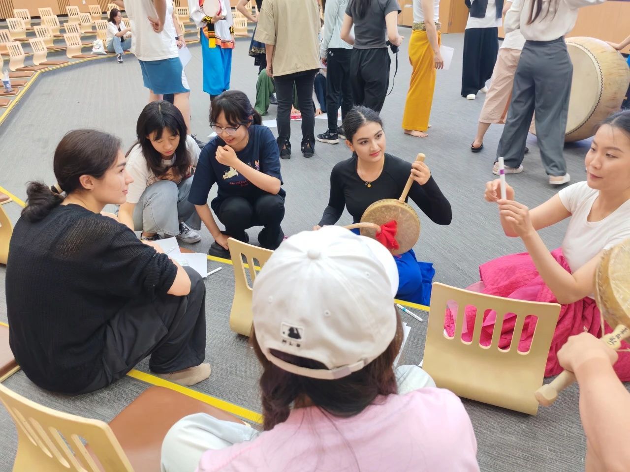 活动第一场,苏娅菲为大家带来了一场别开生面的"鼓乐舞创想美育沉浸式体验"。活动以地域为线索,带领大家开启了一段穿越南北的民族鼓乐舞文化之旅,并通过现场舞蹈示范,让师生们直观领略到不同民族中鼓的独特形制、使用技巧以及所承载的深厚文化内涵。互动环节,现场同学们积极参与,大胆提出创意设想,现场气氛热烈。