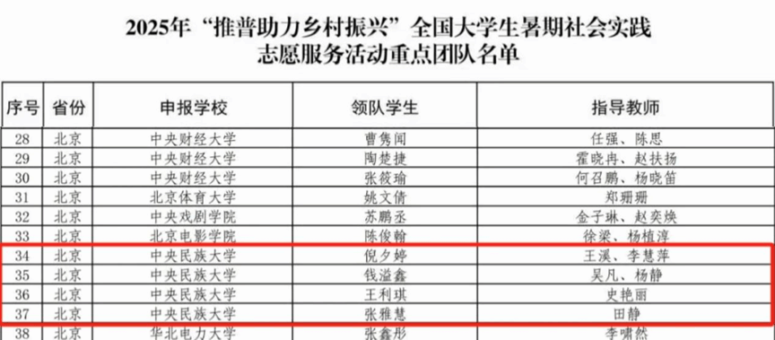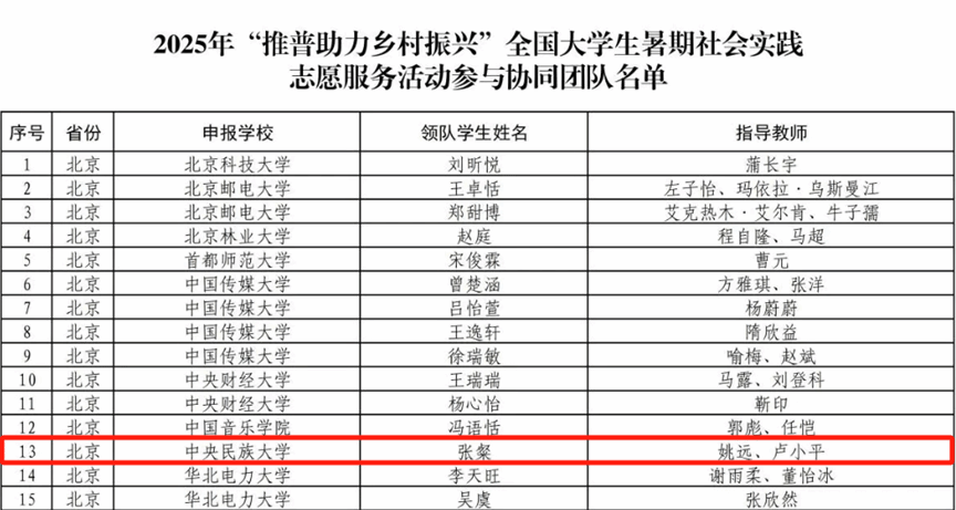 入选的五支队伍将依托专业特色优势,紧扣乡村发展实际,下沉基层一线,精心组织开展主题鲜明、亮点纷呈的推普行动,把理论知识转化为实践动能,引领乡村群众学普、说普、爱普,以民大学子的实干精神,为全面建设社会主义现代化国家、全面推进中华民族伟大复兴凝聚青春智慧与力量。