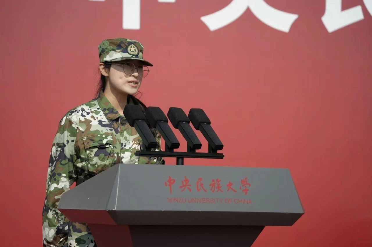 中华民族共同体学院刘思航同学作为参训学生代表发言,她号召同学们,在军训中以汗水磨砺意志,以拼搏铸就品格,强化纪律意识,锻造坚强意志,发扬团结精神,以实际行动展现新时代民大学子昂扬向上、奋发有为的精神风貌。