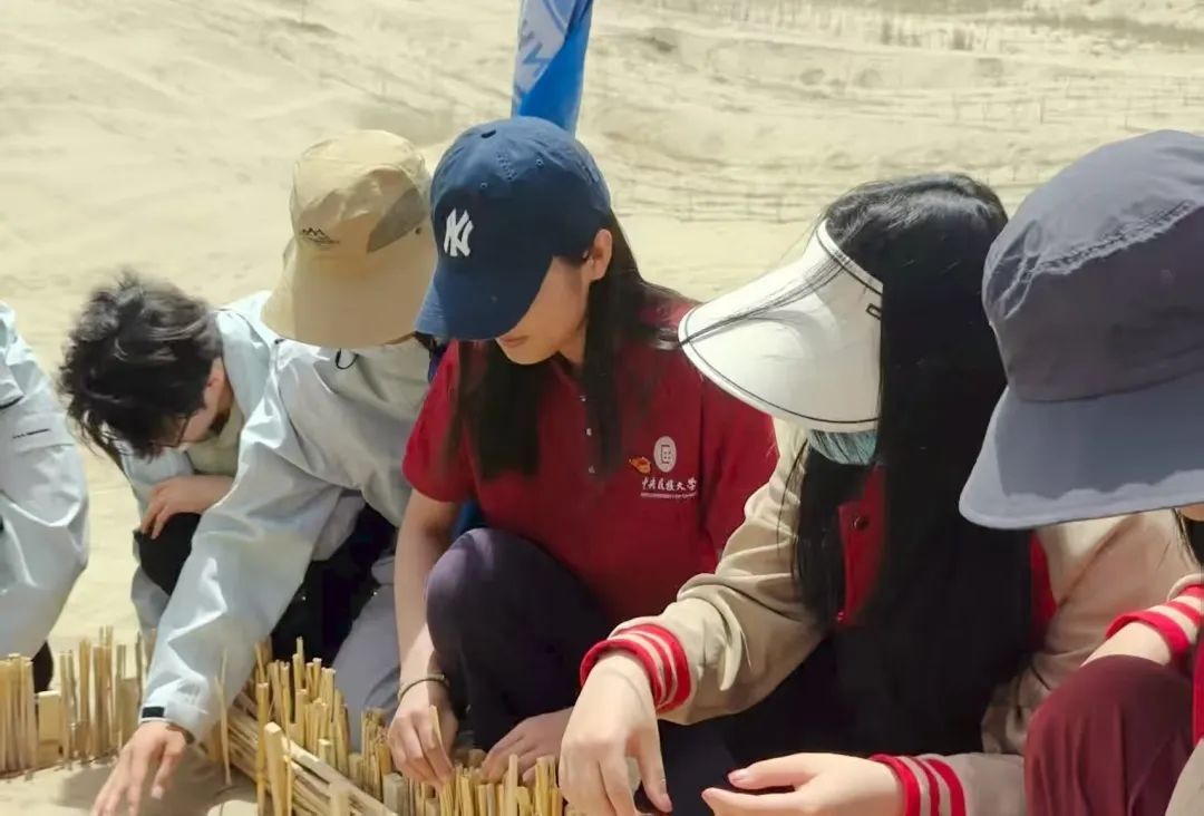 吴怡萱在塔克拉玛干沙漠扎草方格