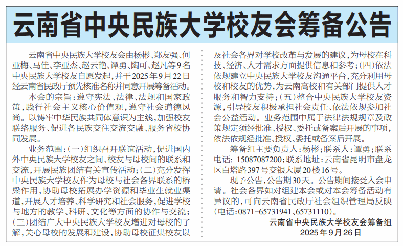 现予公告,公告期30天。公告期间接受入会申请。社会各界如对组建本会或对本会筹备活动有疑议或异议的,可向云南省民政厅社会组织管理局反映(电话:0871-65731941、65731110)。