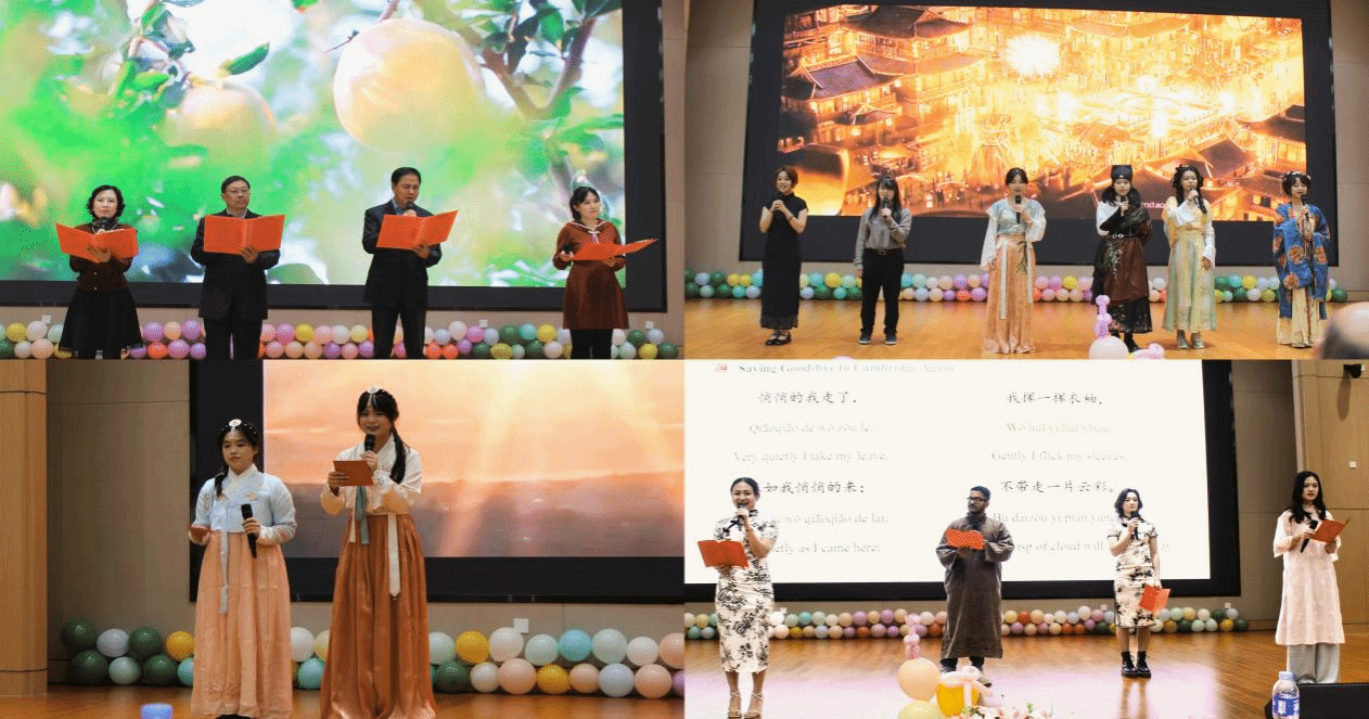 参加现场诵读的包括45名中国本科生和20名国际学生,他们分别来自越南、缅甸、哈萨克斯坦、吉尔吉斯斯坦、印度尼西亚、泰国、韩国、美国、尼泊尔等国家。中外选手以标准的普通话发音,声情并茂地演绎了《光的赞歌》《读中国》《青春》《唐诗里的长安》《中国话》《丝路新声》《秋天里的中国》《我爱你,中国》《诗意中国》《再别康桥》等中华经典诗文。教师代表激情朗诵了《我在一颗石榴中看见了我的祖国》,借石榴的饱满意象,抒发了对悠久历史的深情、对美美与共的礼赞以及对家国的炽热之爱。