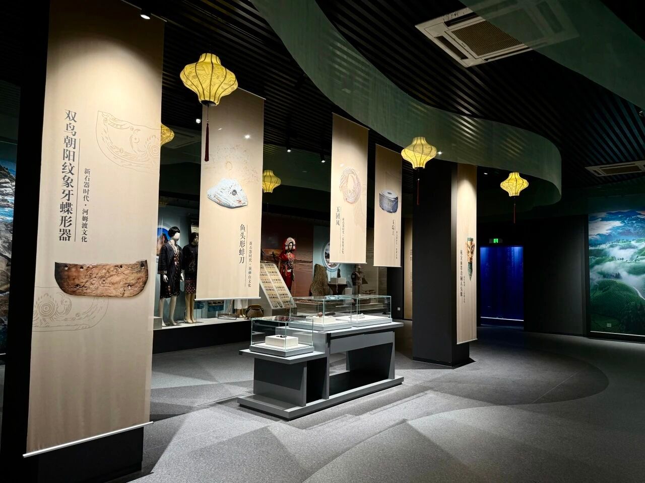 “我们希望通过展览传递的不是简单知识框架,而是对中华文明起源与中华民族多元一体格局的思索与感悟。”策展人林文介绍,中华大地幅员辽阔、生态多样,不同自然环境与生计方式,孕育出各具特色的文化创造。正如考古学家苏秉琦先生所言,中华文明的起源并非单线生成,而是“满天星斗”、多源并起。基于这一认识,展览引入宋蜀华先生的“文化生态区”理论作为策展框架,将文物重新放回其所依存的自然环境与传统生产方式中,进而为理解费孝通先生提出的“中华民族多元一体格局”提供参照。展览采用宋式美学取向的低饱和度空间色调与富有文学气息的展览文本,为观众营造一处可以凝神观看、自由体悟的文化空间,引导大家在审美体验中体悟多元之美与一体之魂。