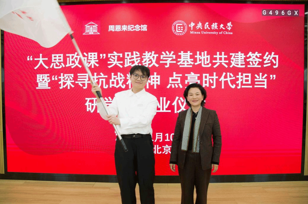 周恩来纪念地管理局党委书记、局长、周恩来纪念馆馆长祁素娟与研学团青年学子代表共同完成研学团团旗交接,标志着本届研学活动圆满收官,象征着红色基因与时代使命的接力传承。