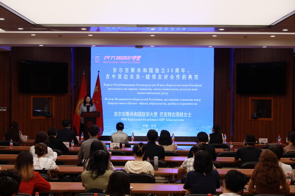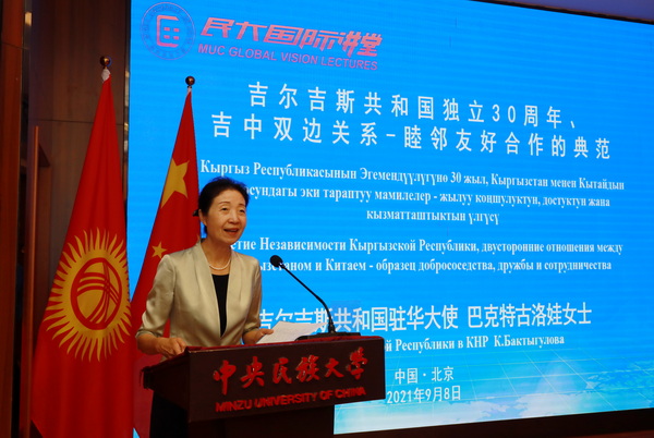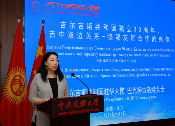 会谈后,在宋敏的主持下,巴克特古洛娃在“民大国际讲堂”发表了题为《吉尔吉斯共和国独立30周年、吉中双边关系-睦邻友好合作的典范》的演讲。她指出,吉中两国一直以来相互信任、友好睦邻的关系有助于巩固两国全面战略伙伴关系,吉尔吉斯斯坦将一如既往与中国睦邻友好,做中国忠实的朋友和可靠的伙伴。她高度评价了吉中两国在政治、经贸、人文,以及安全领域等各方面的合作所取得的丰硕成果,尤其是新冠疫情爆发以来,吉中两国密切合作、并肩作战,共同抗击疫情,再次彰显了两国牢固的友谊和友好睦邻关系。