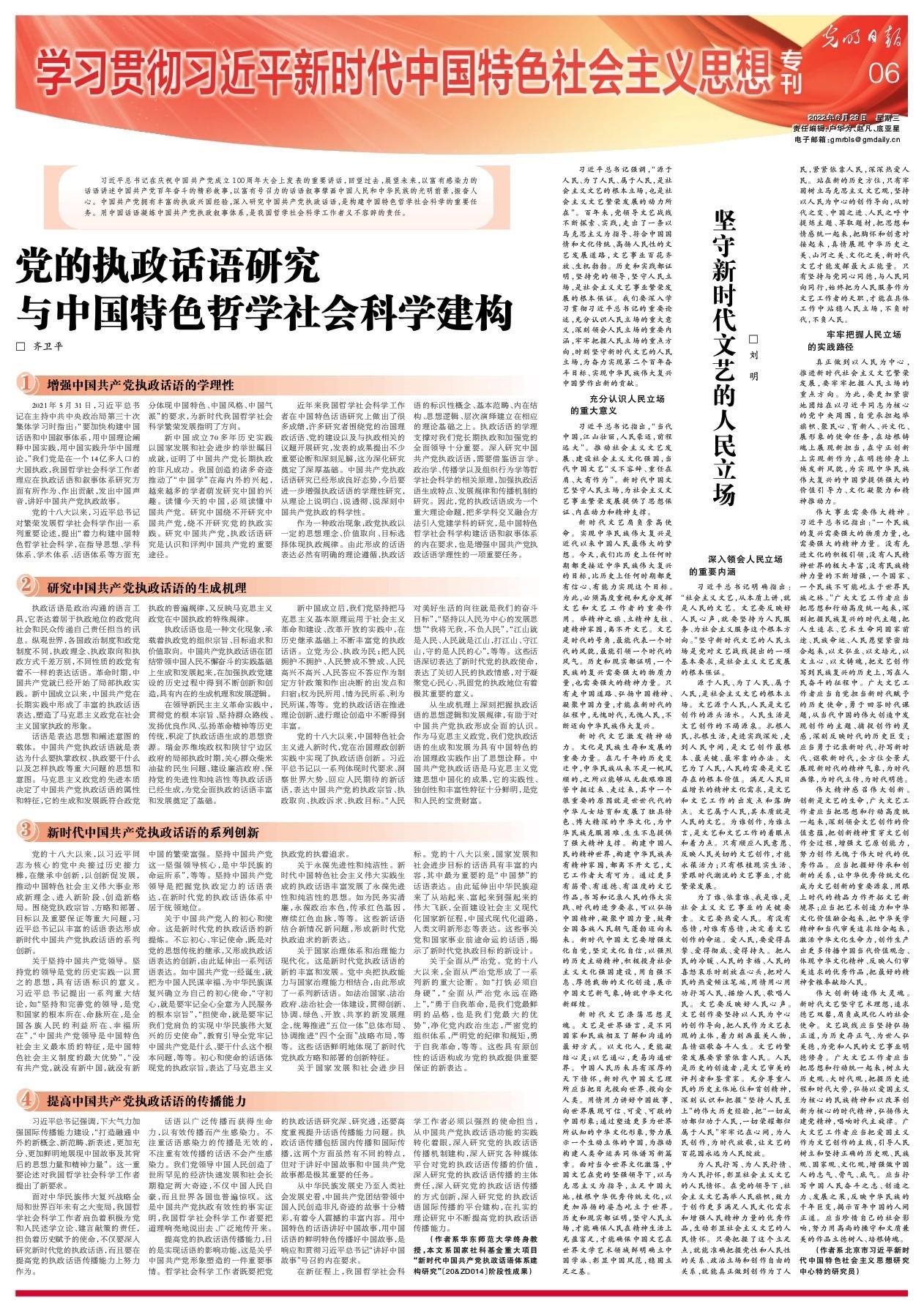 习近平总书记强调,“源于人民、为了人民、属于人民,是社会主义文艺的根本立场,也是社会主义文艺繁荣发展的动力所在”。百年来,党领导文艺战线不断探索、实践,走出了一条以马克思主义为指导、符合中国国情和文化传统、高扬人民性的文艺发展道路,文艺事业百花齐放、生机勃勃。历史和实践都证明,坚持党的领导,坚守人民立场,是社会主义文艺事业繁荣发展的根本保证。我们要深入学习贯彻习近平总书记的重要论述,充分认识人民立场的重大意义,深刻领会人民立场的重要内涵,牢牢把握人民立场的重点方向,时刻坚守新时代文艺的人民立场,为奋力实现第二个百年奋斗目标、实现中华民族伟大复兴中国梦作出新的贡献。