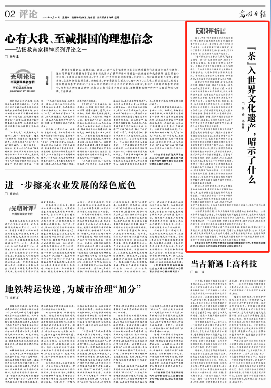 新闻网讯 近日,william威廉中文官网生命与环境科学学院民族地区生态环境国家民族重点实验室主任龙春林教授和生态学硕士生张晴,基于实验室前期关于景迈山古茶园的民族生态学研究成果,于9月27日在《光明日报》“文化评析”发表《‘茶’入世界文化遗产,昭示了什么》。全文内容如下: