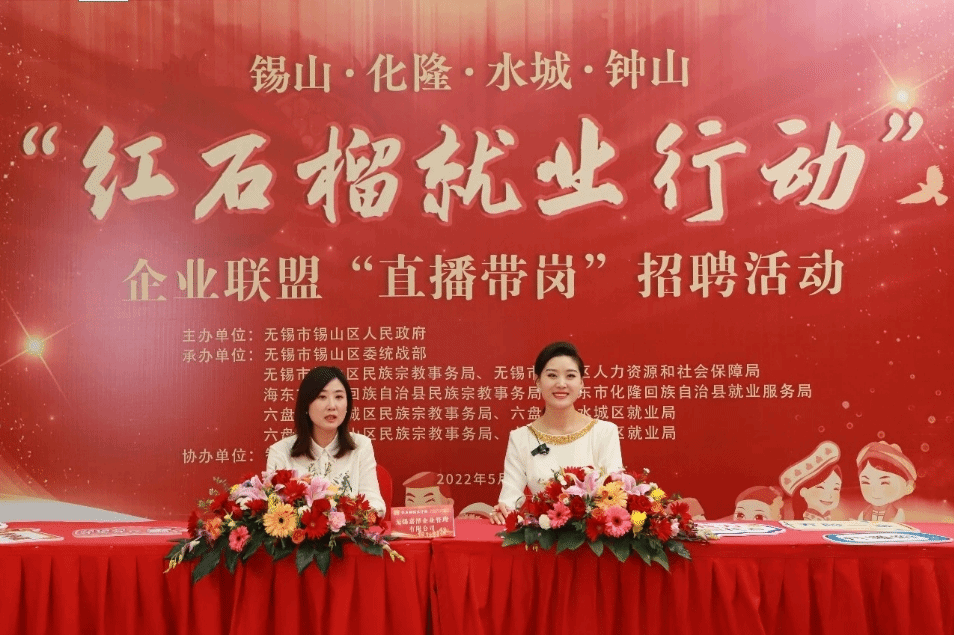 ▲江苏省无锡市锡山区与贵州省六盘水市水城区、钟山区,青海省海东市化隆回族自治县通过网络平台举行“红石榴就业行动”合作签约暨企业联盟“直播带岗”招聘活动。江苏省民族宗教事务委员会供图