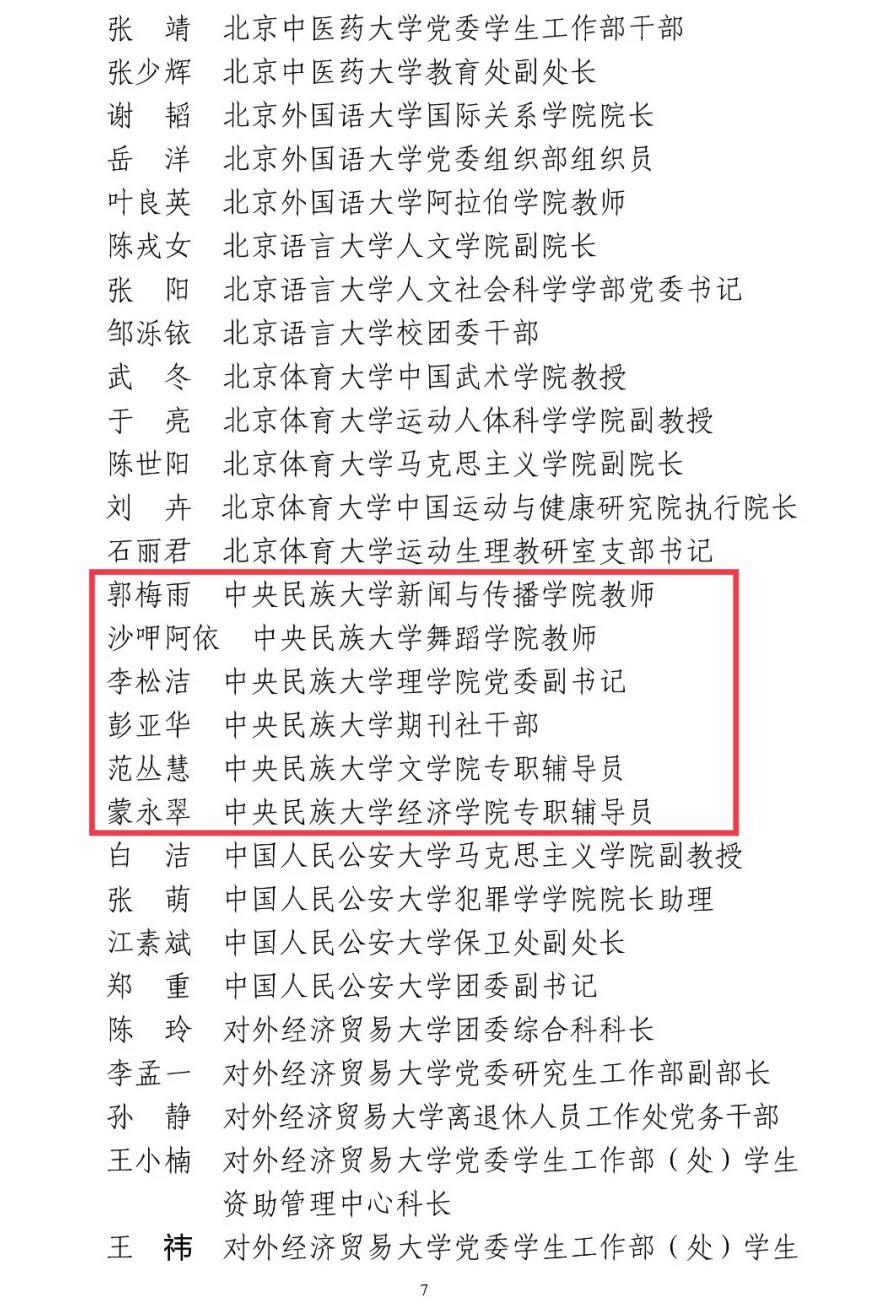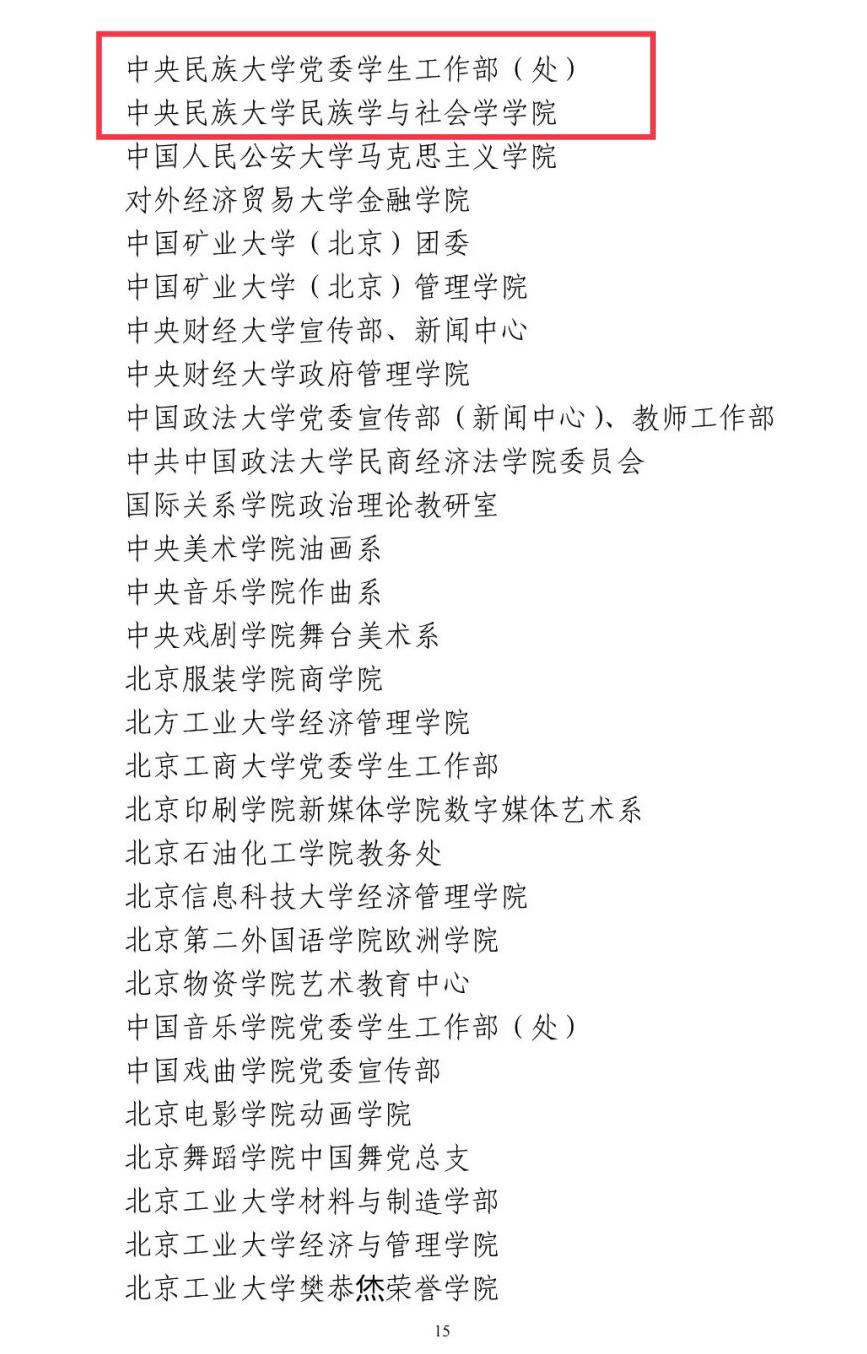 我校党委学生工作部(处)、民族学与社会学学院2个单位获评2017-2021年度北京高校德育工作先进集体;6人获评2017-2021年度北京高校优秀德育工作者,3人获2017-2021年度北京高校优秀辅导员荣誉称号。
