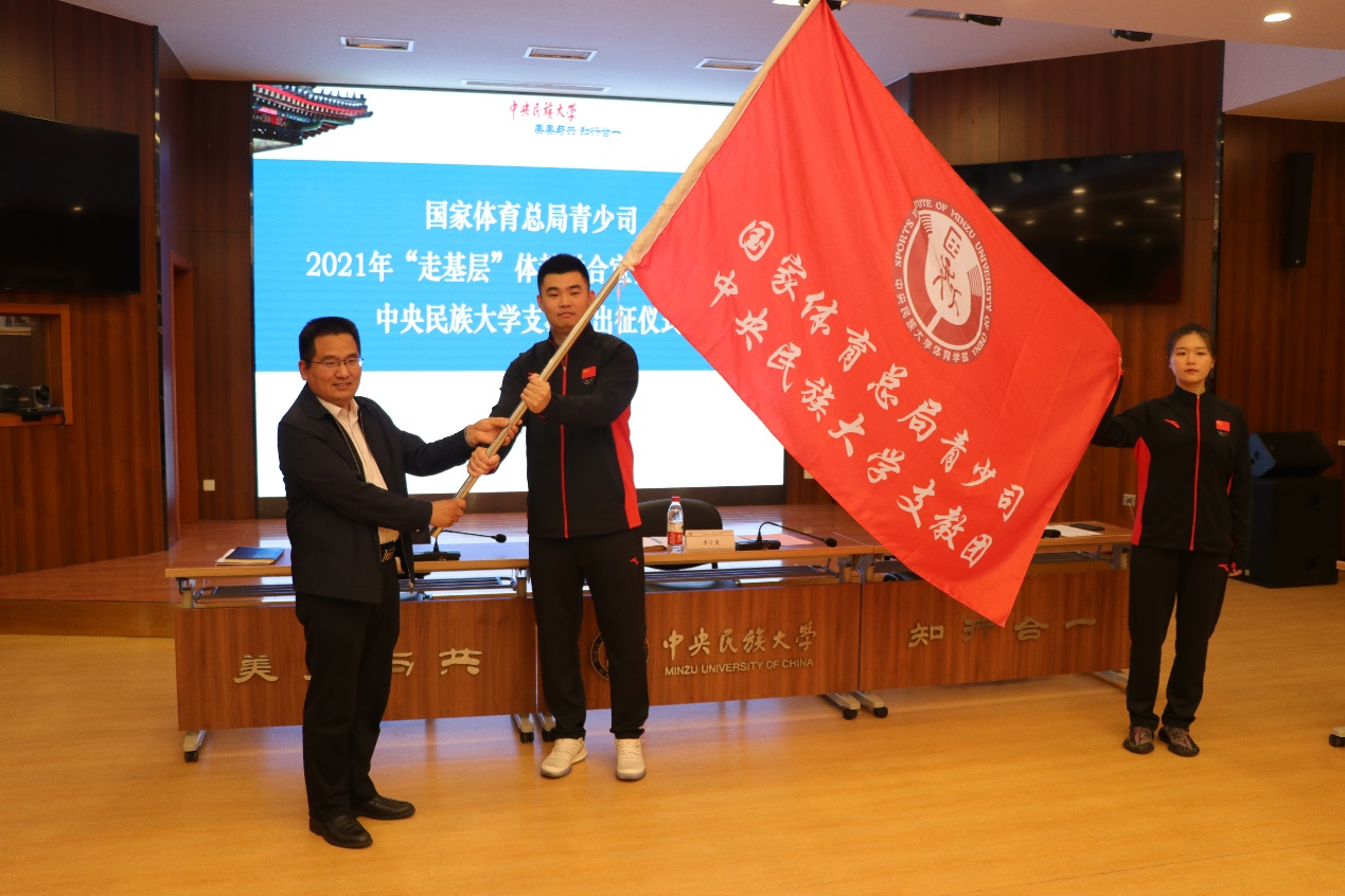 2021年10月7日,国家体育总局青少司2021年“走基层”体教融合宣传采访活动william威廉中文官网支教团出征仪式在知行堂举行。校党委副书记、副校长李计勇做动员讲话,并为支教团授旗。