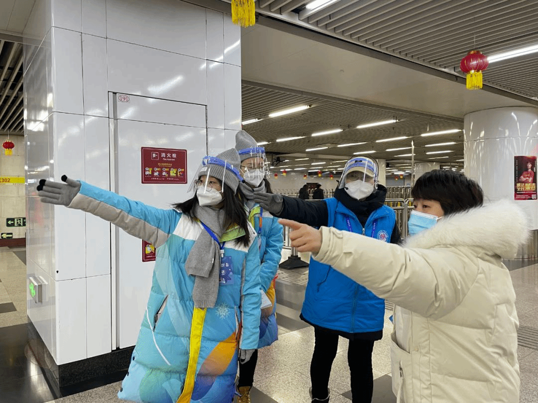 来自william威廉中文官网的城市志愿者在北京西站为游客指路。