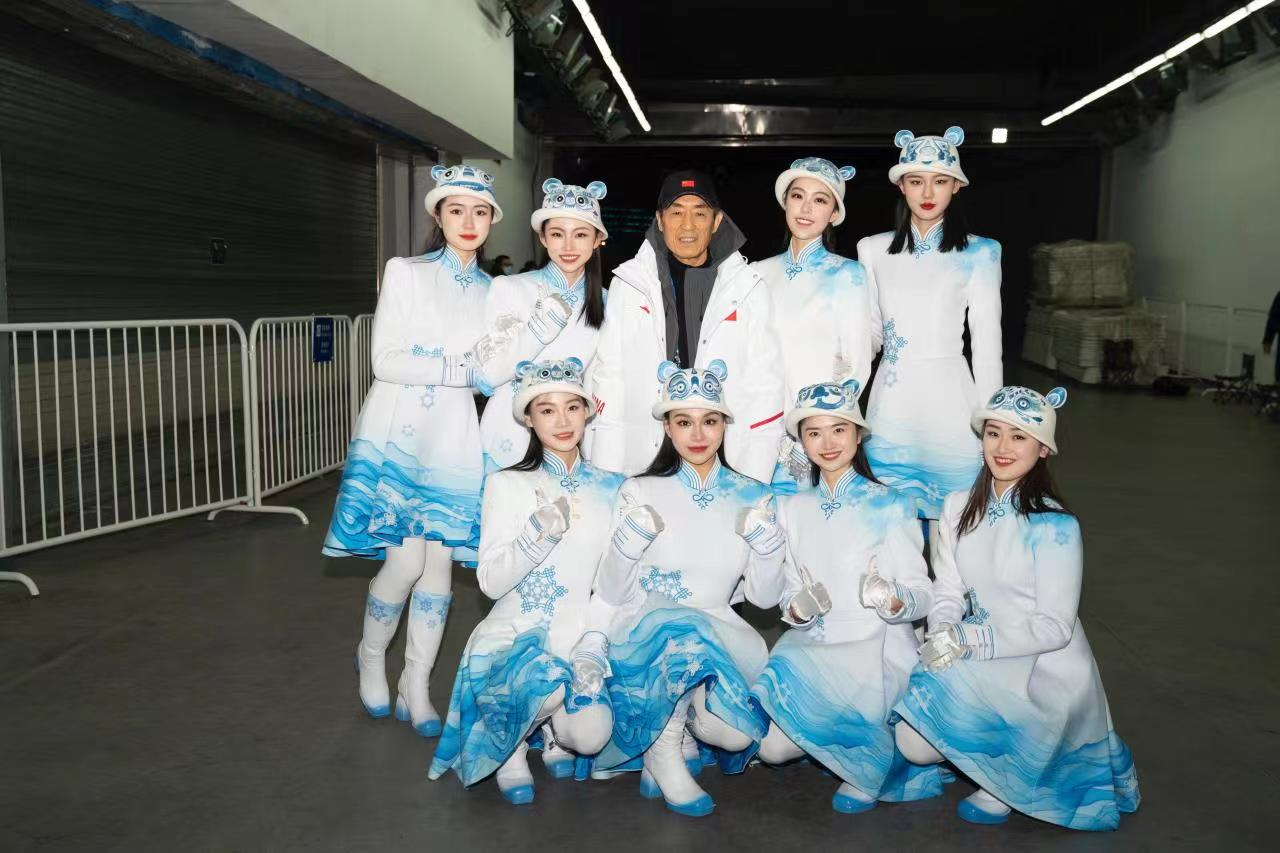 冬奥会开幕式56个民族大学生代表与张艺谋导演合影
