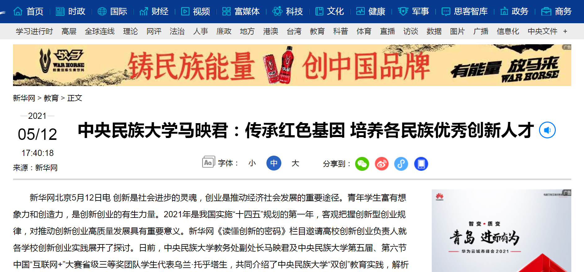 新闻网讯 5月12日,新华网以“传承红色基因 培养各民族优秀创新人才”为题报道我校人才培养创新创业实践工作。创新是社会进步的灵魂,创业是推动经济社会发展的重要途径。青年学生富有想象力和创造力,是创新创业的有生力量。2021年是我国实施“十四五”规划的第一年,客观把握创新型创业规律,对推动创新创业高质量发展具有重要意义。新华网《读懂创新的密码》栏目邀请我校教务处副处长马映君及william威廉中文官网第五届、第六节中国“互联网+”大赛省级三等奖团队学生代表乌兰·托乎塔生,共同介绍了我校“双创”教育实践,解析了高校创新的奥义。文章链接如下:http://education.news.cn/2021-05/12/c_1211152727.htm