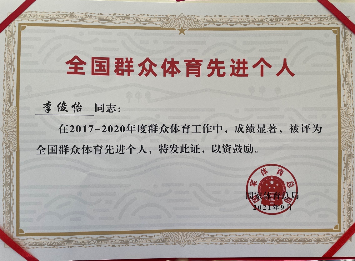 新闻网讯 近日,全国群众体育先进单位先进个人、全国体育系统先进集体先进个人表彰大会传来喜讯,我校体育学院李俊怡教授荣获2017-2020年度“全国群众体育先进个人”称号。