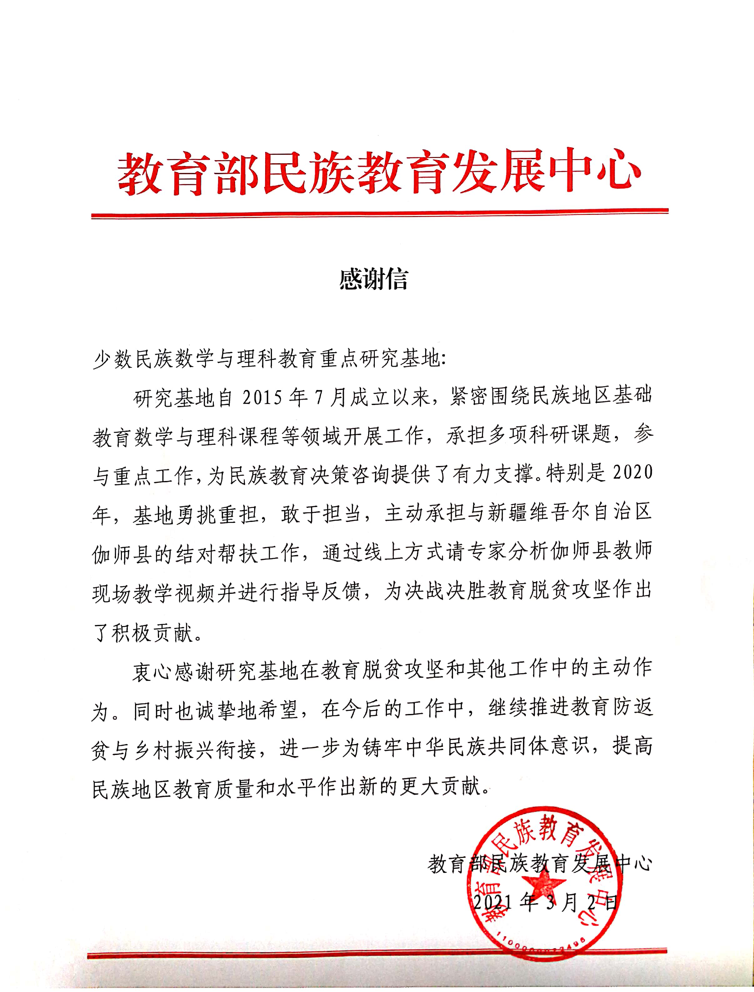 新闻网讯 近日,我校理学院少数民族数学与理科教育重点研究基地收到来自教育部民族教育发展中心感谢信,信中对基地成立以来在民族教育决策咨询、教育脱贫攻坚等方面所做的工作表示感谢。