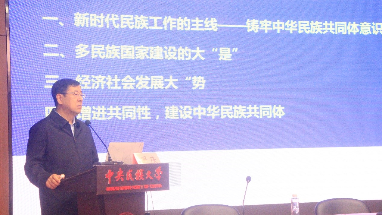论坛邀请我校严庆教授作《新时代铸牢中华民族共同体意识》主旨报告。严庆深入阐释了“铸牢中华民族共同体意识”理论内涵,指明铸牢中华民族共同体意识是新时代民族工作的主线,也是这个时代的课题和我们的使命。他提出,从我国多民族国情、国家建设理论、国际国内挑战、中华民族驶入快车道等多角度深刻理解和把握需要铸牢中华民族共同体意识。严庆指出8月召开的中央民族工作会议提出“12个必须”,已经进一步明确了铸牢中华民族共同体意识的新要求。他从多民族国家建设的大“是”、经济社会发展大“势”两个维度,以铸牢中华民族共同体意识的生动实践事例和成果,引导与会人员深入思考铸牢中华民族共同体意识的实践路径与有效模式。严庆重点强调“增进共同性,建设中华民族共同体”,要正确把握“四个关系”,按照增进共同性的方向改进民族工作。铸牢中华民族共同体意识贯彻于少数民族预科教育实践,就是要扎实推进铸牢中华民族共同体意识教育,促进各民族同学交往交流交融,立志服务于实现中华民族伟大复兴的中国梦。