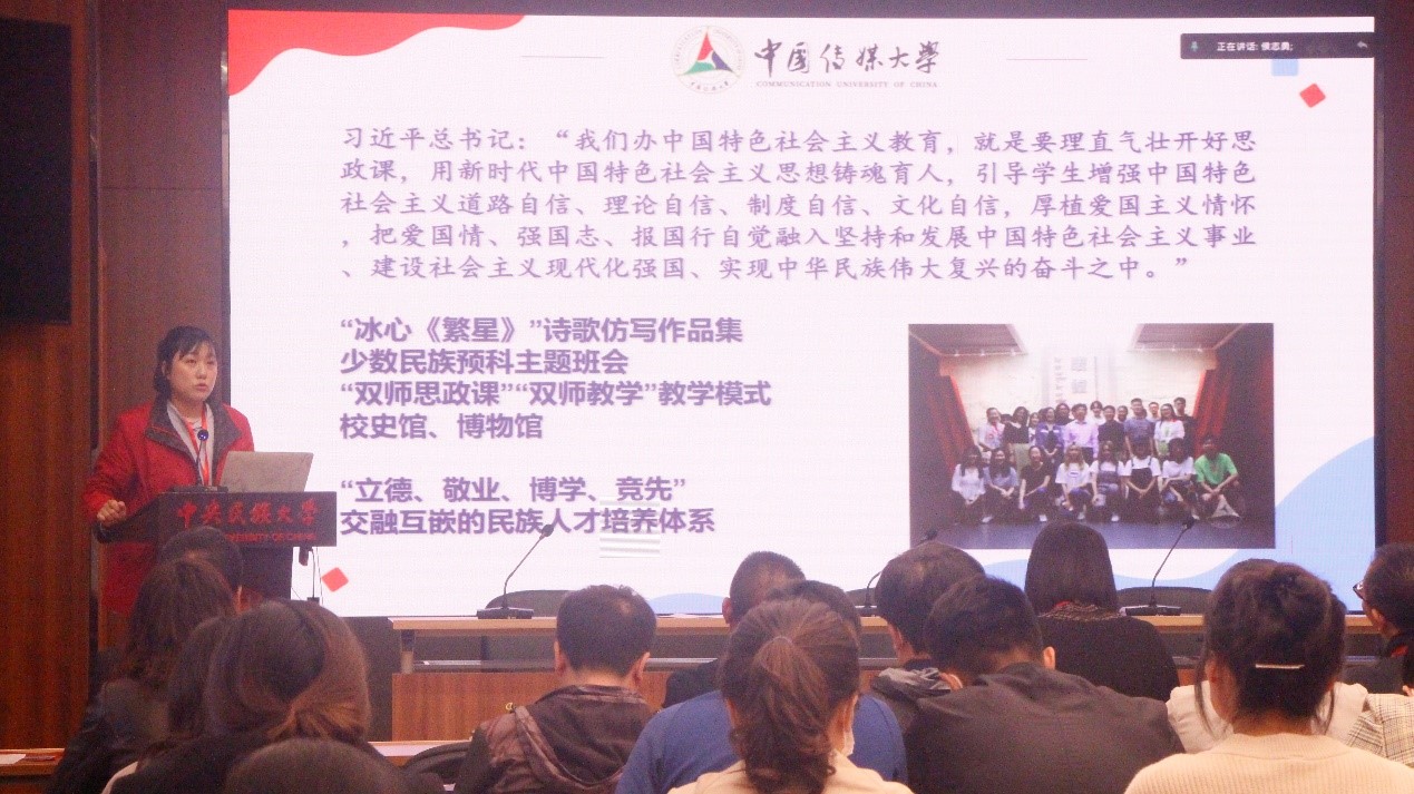 中国传媒大学王克家老师以《铸牢中华民族共同体意识 突出传媒特色 培养民族英才》为题,介绍了中国传媒大学2018年开始自主培养少数民族预科生以来的探索经验。学校是发挥自身专业特色,全面加强国家通用语言文字教育;强调多学科渗透,构建民族团结进步教育课程体系;坚持思想引领,厚植少数民族学生的爱国主义情怀。