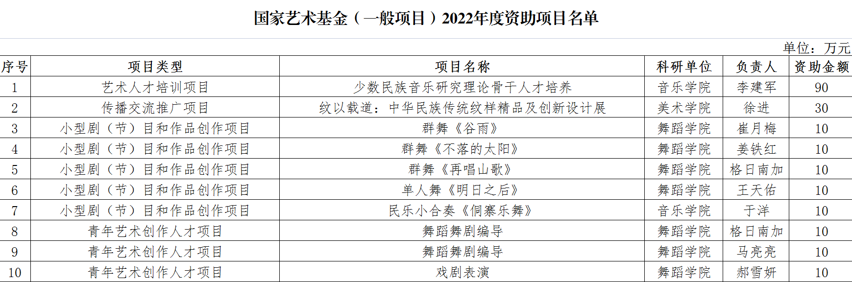 新闻网讯 近日,根据国家艺术基金管理中心公布的2022年度国家艺术基金立项情况,本年度国家艺术基金共评选资助项目600余项,我校获得10项资助。其中舞蹈学院7项、音乐学院2项、美术学院1项,立项率达到12.8%,远超本年度国家艺术基金5.7%的立项率。