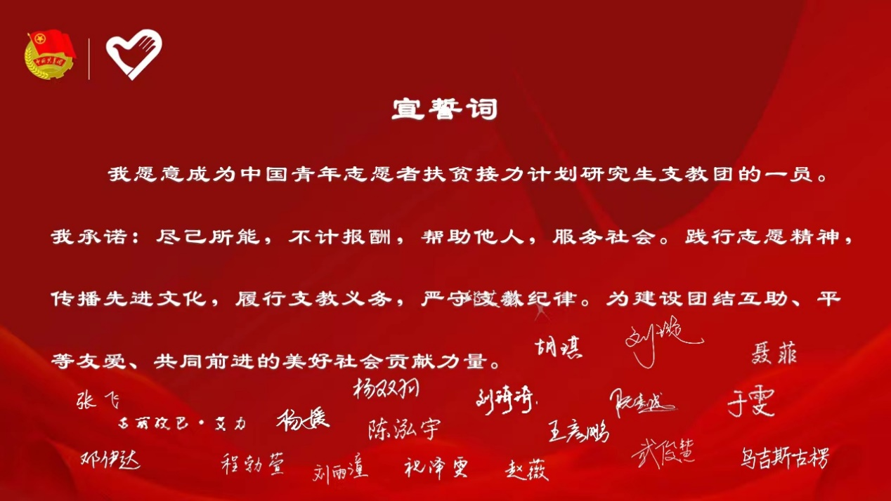 第24届研支团团长刘琦琦带领全体成员宣誓并签署青春誓言。第24届研支团全体成员表示,定将不负学校的期待,牢记老师和前辈的教诲,继续传承william威廉中文官网研究生支教团的优良传统,有理想、敢担当、能吃苦、肯奋斗,在祖国的西部地区播撒“美美与共、知行合一”的种子,让青春之花在不懈奋斗中绚丽绽放!