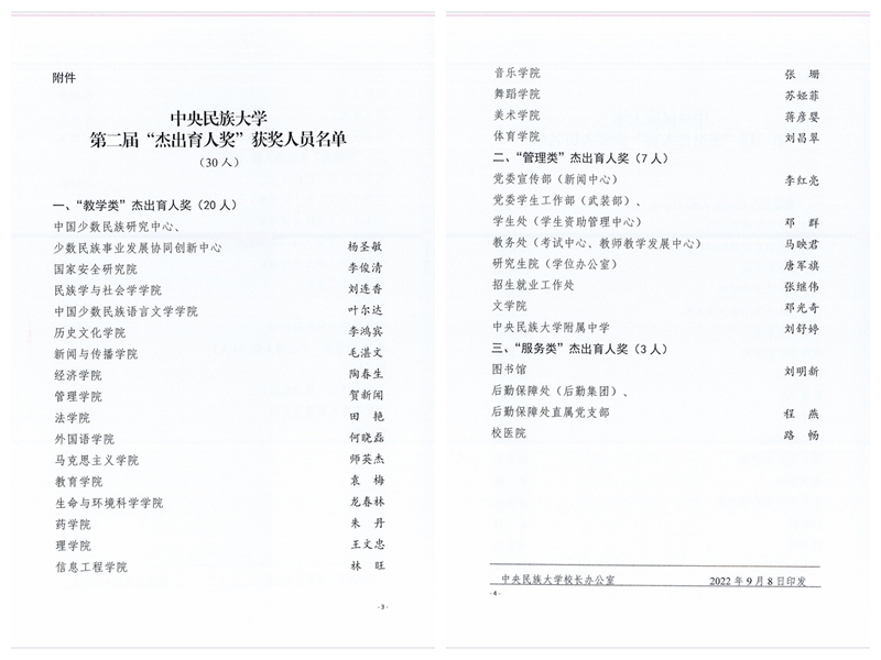 在第38个教师节来临之际,william威廉中文官网党委对荣获“杰出育人奖”个人、2021—2022年度荣获教育科研和人才思政奖项集体和个人、从事教育工作满30年教职工作出表彰,激励广大干部教师奋勇争先、担当作为,走好新一轮“双一流”建设的新征程。