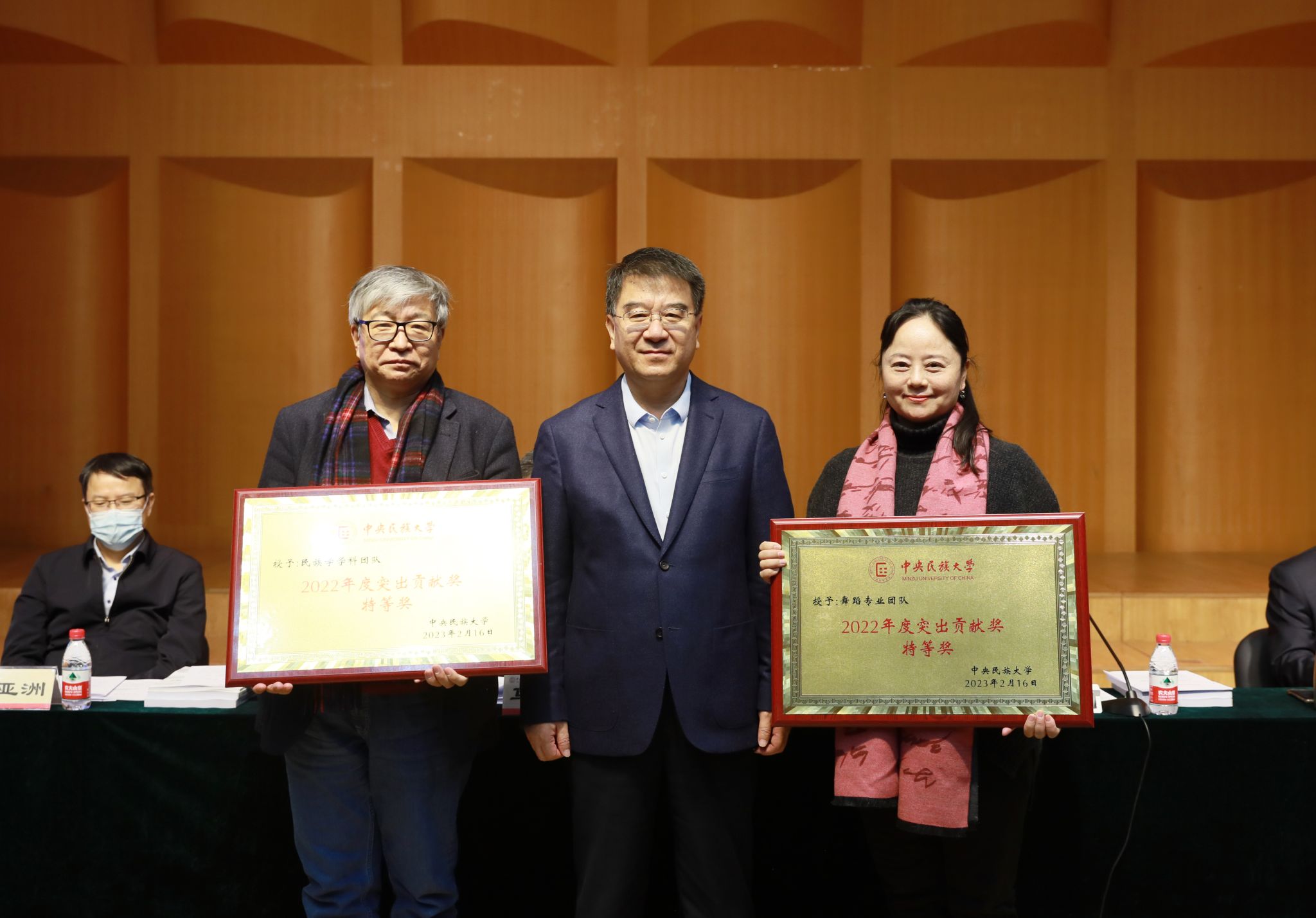 新闻网讯 2月16日上午,学校“2022年度突出贡献奖”“‘三全育人’模范”表彰会在海淀校区中慧楼音乐厅召开,对过去一年为学校事业发展作出突出贡献的集体和个人进行表彰。民族学学科团队、舞蹈专业团队等2个集体被授予“2022年度突出贡献奖特等奖”,音乐与舞蹈学学科团队、汉语国际教育专业团队、马克思主义学院等3个集体被授予“2022年度突出贡献奖一等奖”,招生就业处、校团委等2个集体被授予“2022年度突出贡献奖二等奖”。杨宗丽、袁梅、陈钧等3位同志获“国家民委‘三全育人’模范”表彰。党委书记张京泽,党委副书记、校长郭广生为获奖单位和个人颁奖。