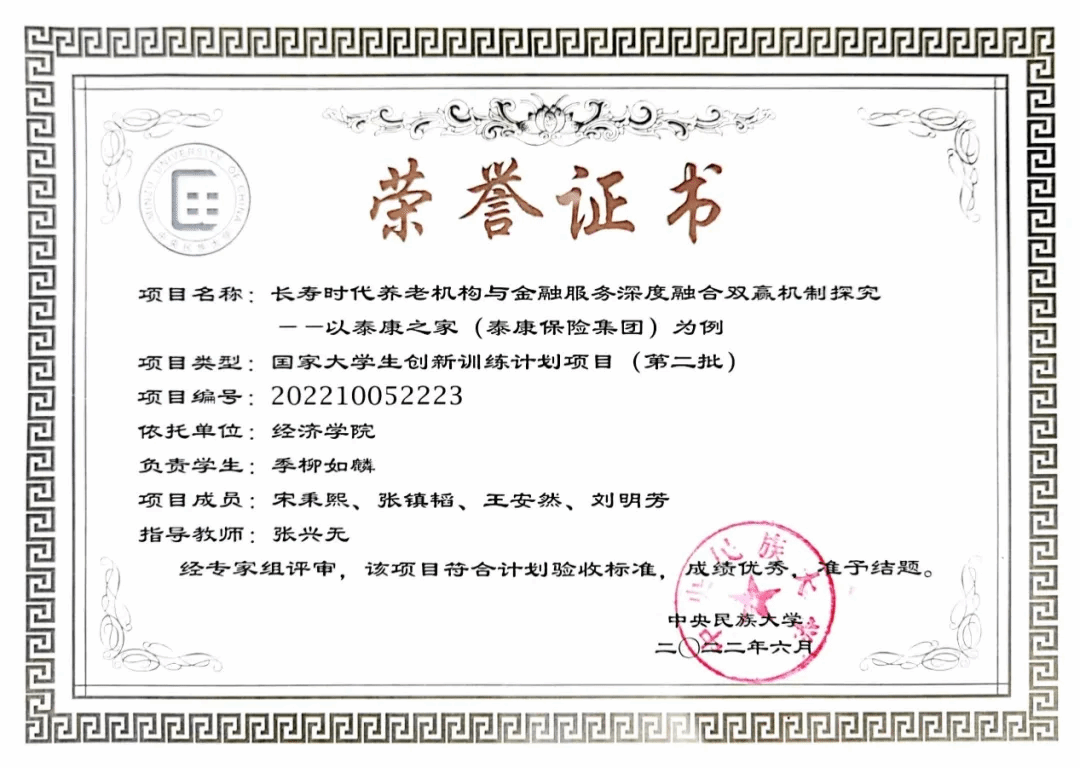 我第一次主持参加大学生创新训练计划,准备提交立项书时内心的紧张与忐忑至今仍记忆犹新。历时一年的时间,我与团队成员调研走访了北京市各种类型的养老院,并访谈相关从业人员,完成了我们的第一个研究项目《长寿时代养老机构与金融服务深度融合双赢机制探究——以泰康之家(泰康保险集团)为例》,获得了国家级优秀结项。