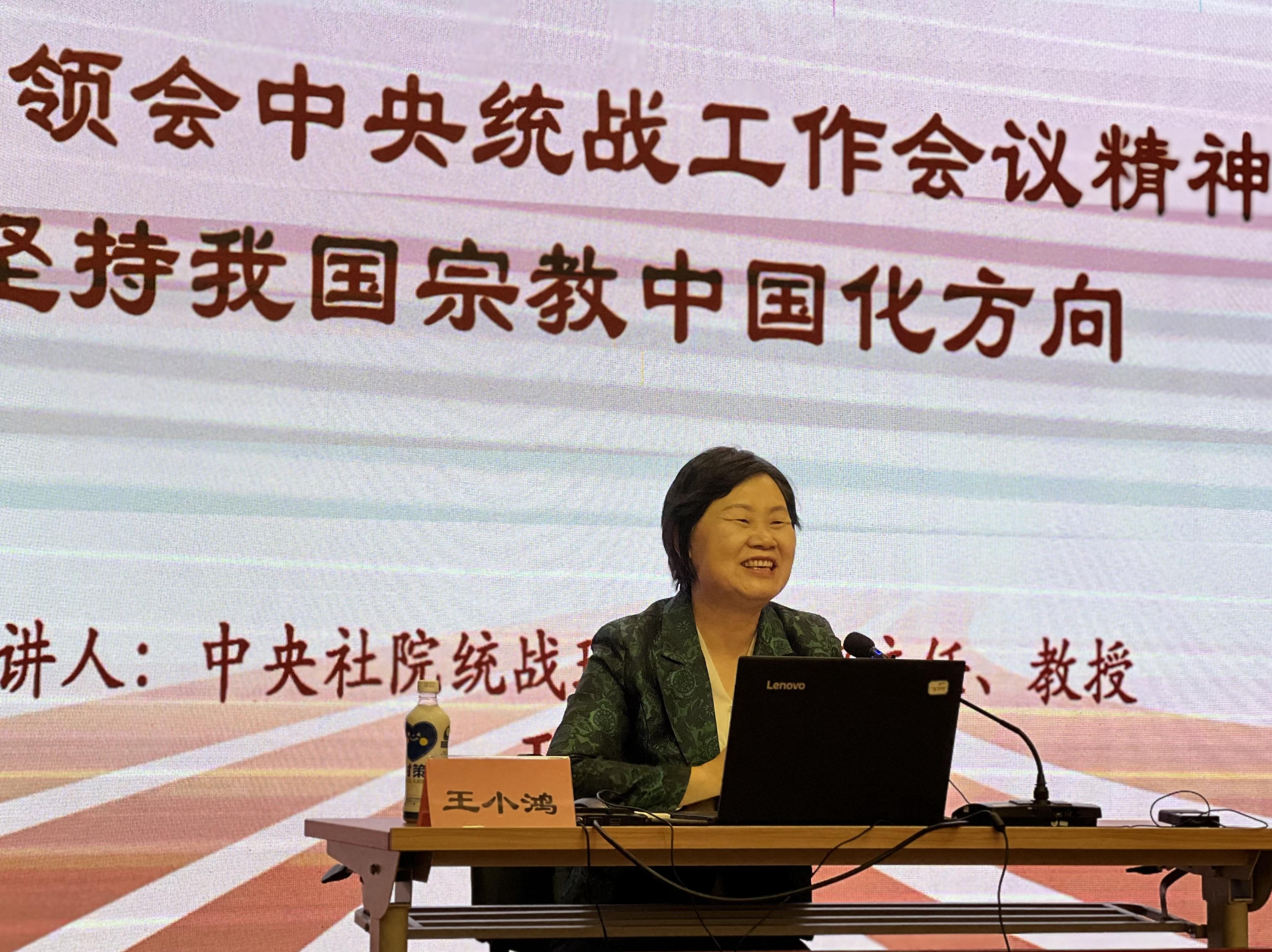 王小鸿从六个方面解读了习近平总书记在中央统战工作会议以及全国宗教工作会议上的重要讲话精神,阐释了深刻把握新时代统战工作的核心要义和精神实质,分析了统战工作的地位和作用、特点和规律。讲座还就进一步做好新时代高校统战线工作和宗教工作,切实提升做好新时代统战工作的能力,做了理论分享。