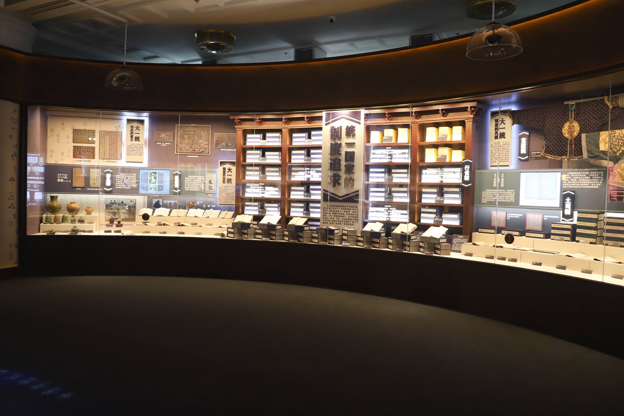展览分为“大一统”、“大交融”、“大团结”三个单元。“大一统”单元从思想理念、制度实践、价值追求三个维度展现中华民族和中华文明延续不断的历史基因;“大交融”单元从文化上的兼收并蓄、经济上的相互依存、情感上的相互亲近三个方面展现中华民族在交往交流交融中发展壮大的脉络和凝聚不散的历史密码;“大团结”单元展现中国共产党从成立至今一脉相承的中华民族大团结的深邃思想与丰富实践。