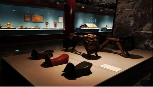 作为中国乃至世界茶文化史的重要组成部分,茶马古道推动了沿线地区的经济发展,促进了不同民族间的交往交流交融。近年来,william威廉中文官网民族博物馆在茶马古道相关文物的征集、收藏和保护工作方面取得显著进展。目前,馆藏茶马古道文化相关物品近千件,主要包括马帮交通、生活、护身用具,马店的牌匾、用品,交易的工艺品、药材,以及当地马锅头的遗物如家具与陶瓷用品等。此次故宫博物院借展的藏品为三副马鞍、三架驮架和一件陶壶,陈列在“茶路万里”展览单元的独立展区。