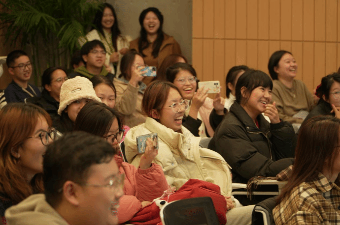 活动现场,沙沙作响的枫叶为悠悠的说书声合奏,李伟建一行为现场的同学们带来了精彩纷呈的相声表演,面对面的“说学逗唱”不仅是一段沉浸式的相声体验,更让同学们身临其境地感受到了曲艺相声之美、语言艺术之趣。普及的相声曲艺历史和文化知识,从古今中外戏剧演变到当代相声文化发展,内容丰富多彩,引人入胜。