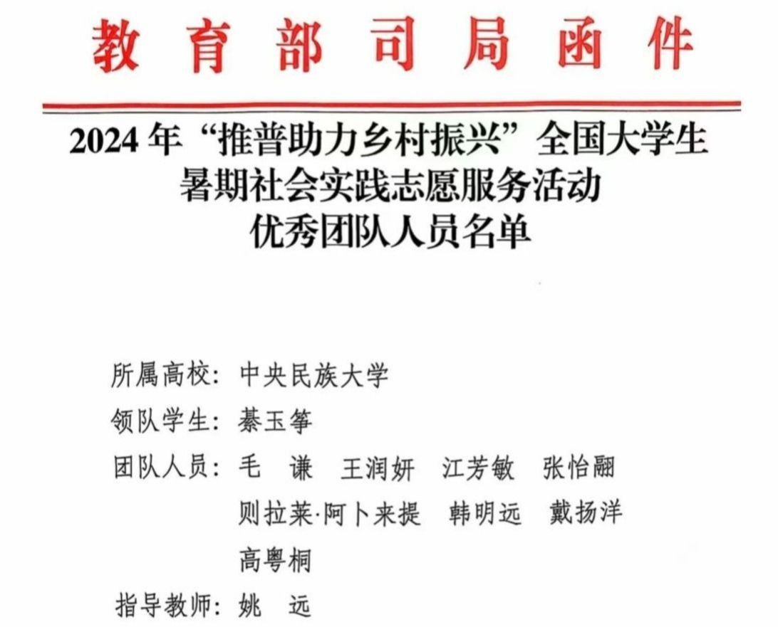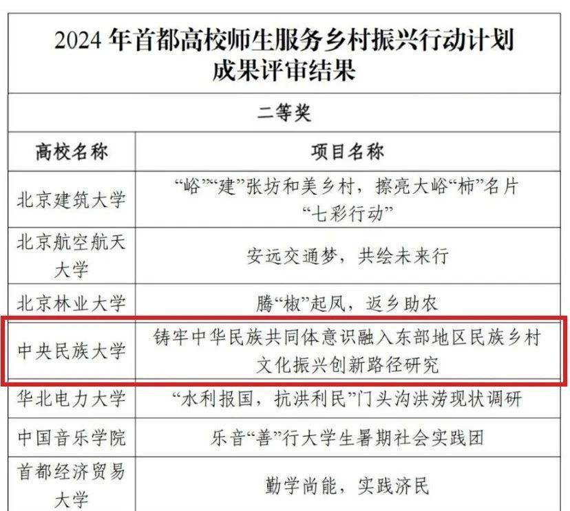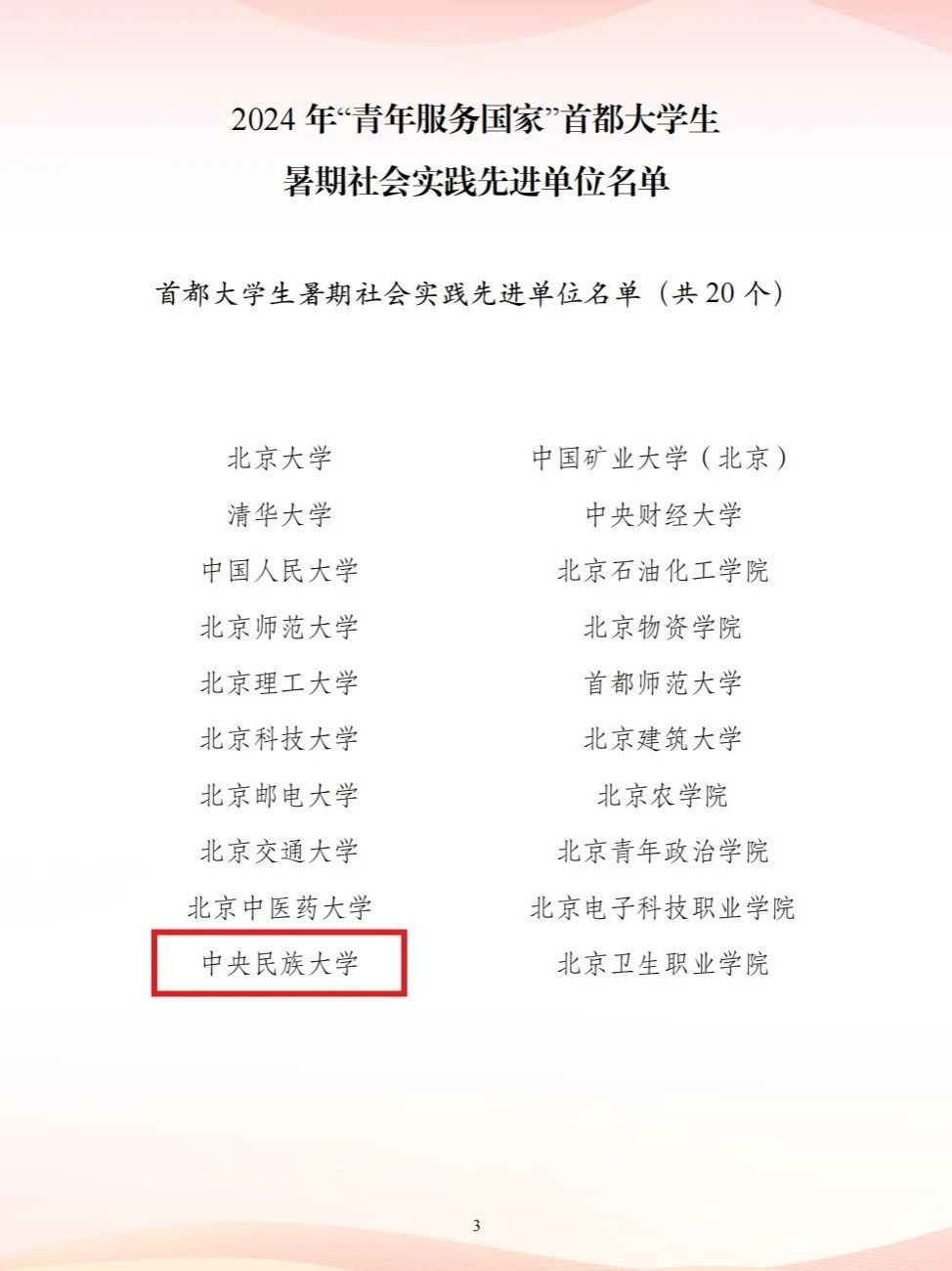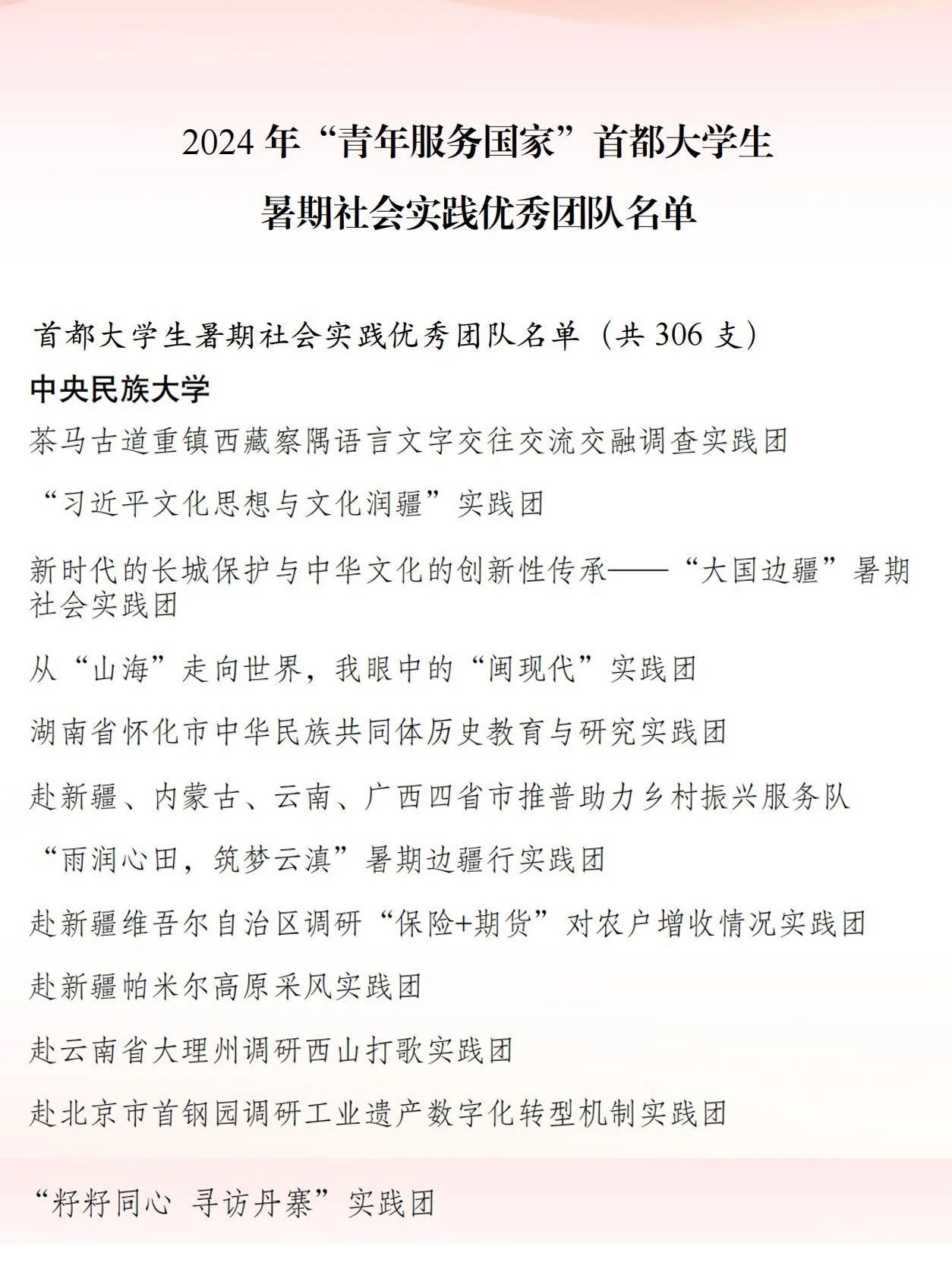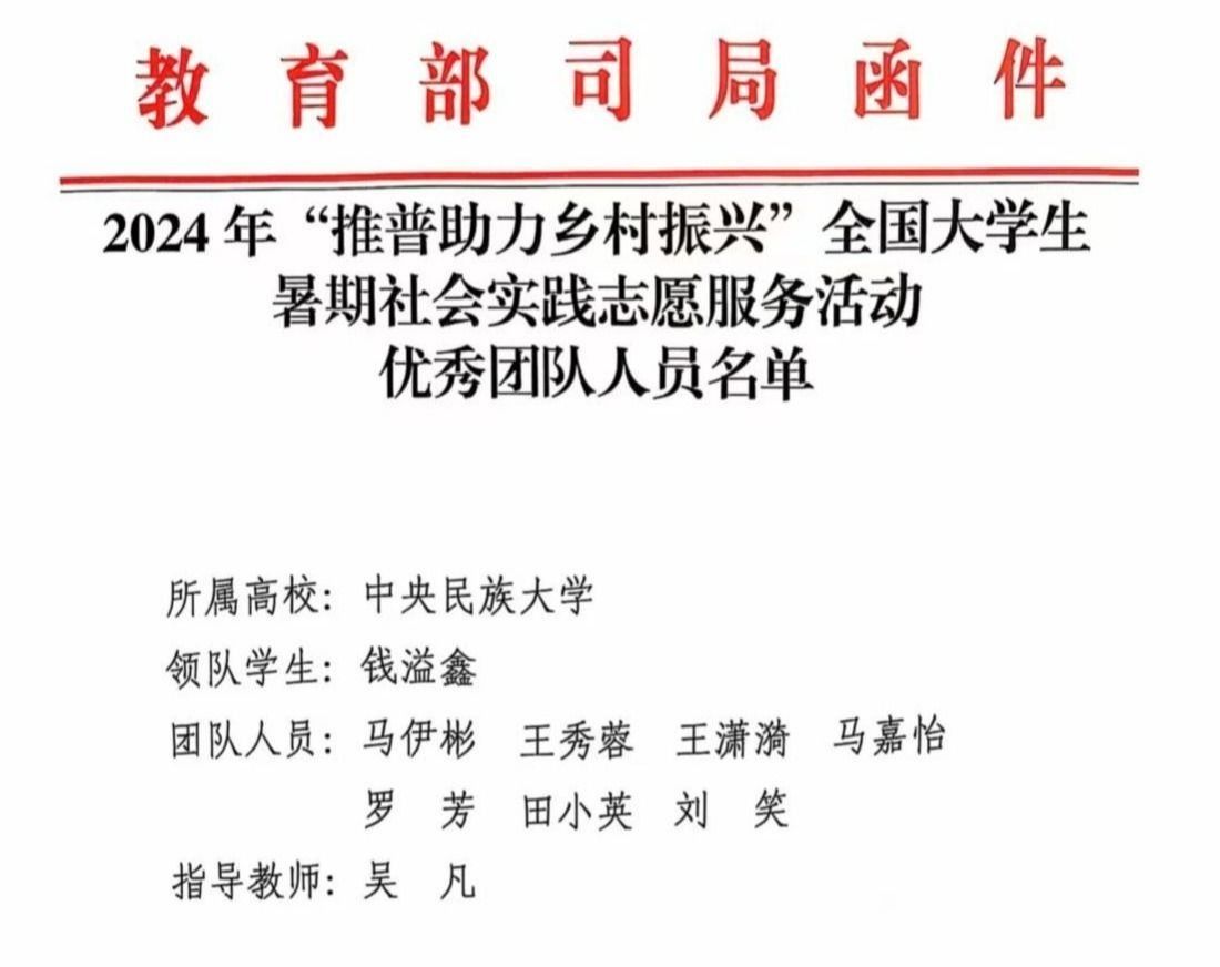 新闻网讯  2024年,民大师生凝心聚力,在“青年服务国家”首都大学生暑期社会实践、“时代新人强国行”首都大学生主题社会实践、“推普助力乡村振兴”全国大学生暑期社会实践志愿服务活动、首都高校师生服务乡村振兴行动计划等各类重大实践活动中斩获集体、团队、项目和个人类别荣誉奖项,其中,学校获得2024年“青年服务国家”首都大学生暑期社会实践先进单位。民大人用行动诠释了“心中有情、脚下有泥、肩上有责”的使命与担当。