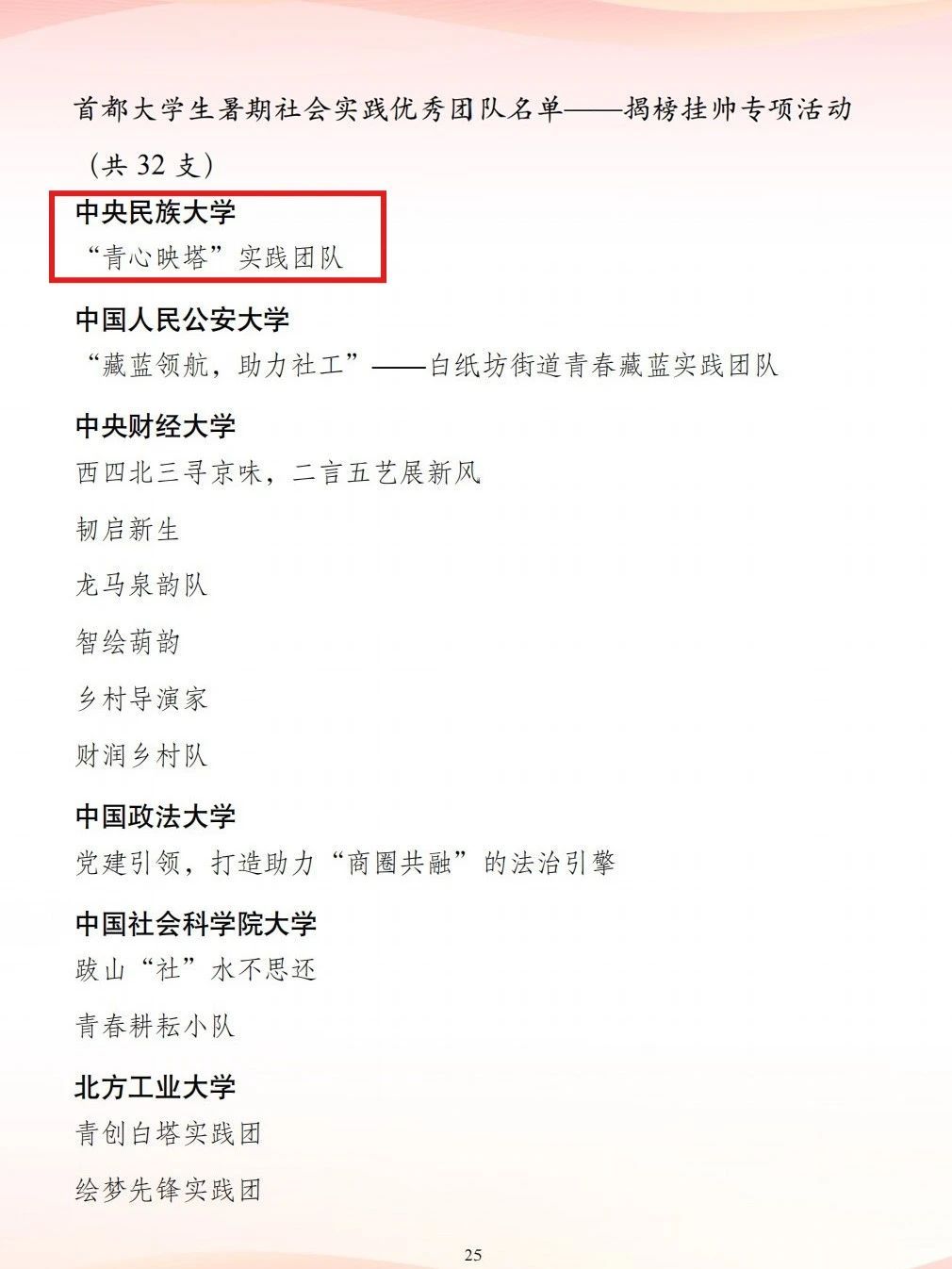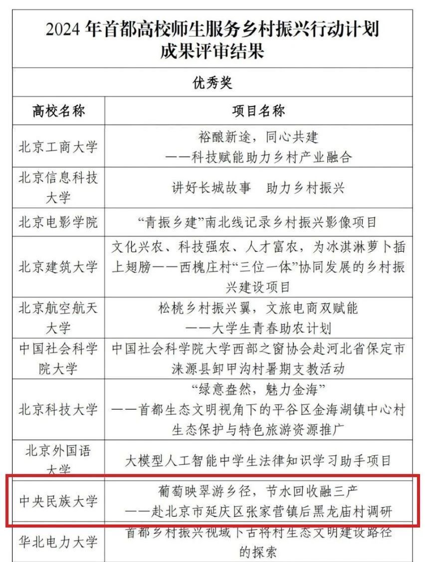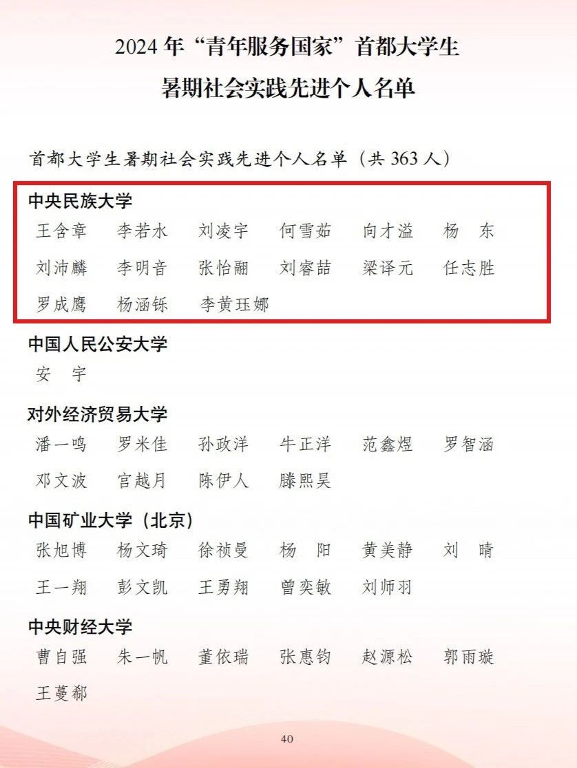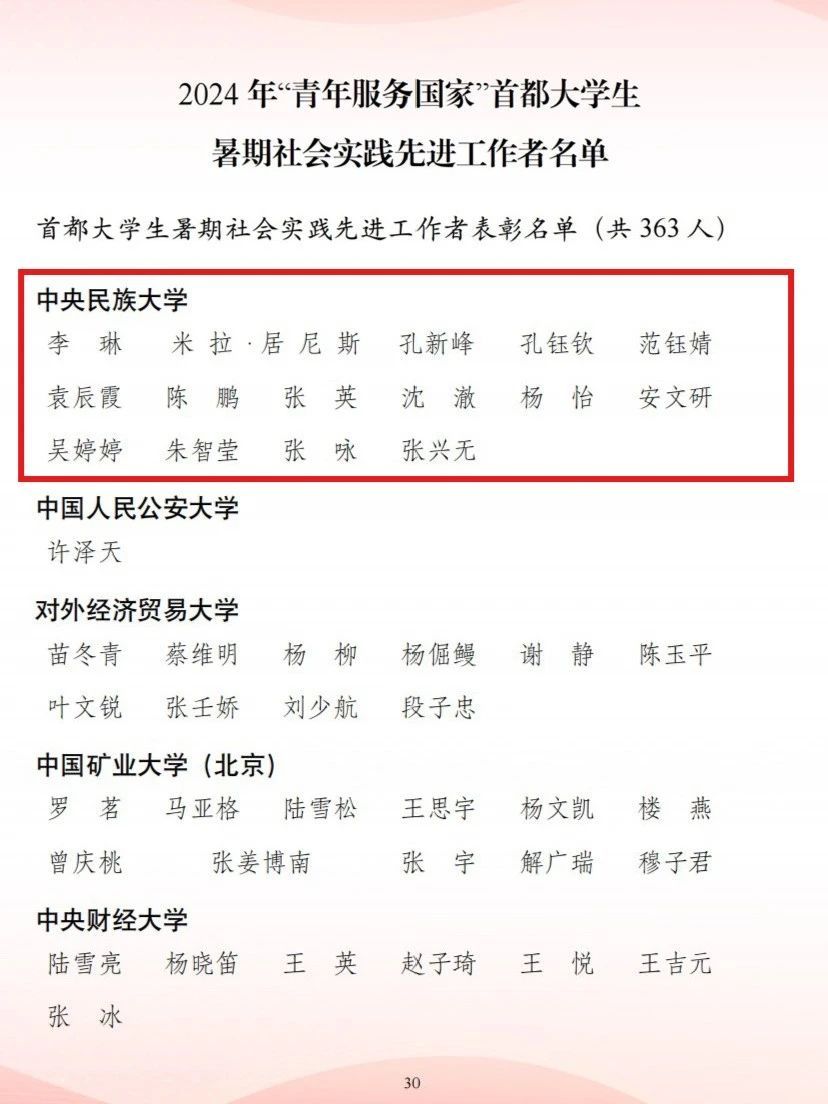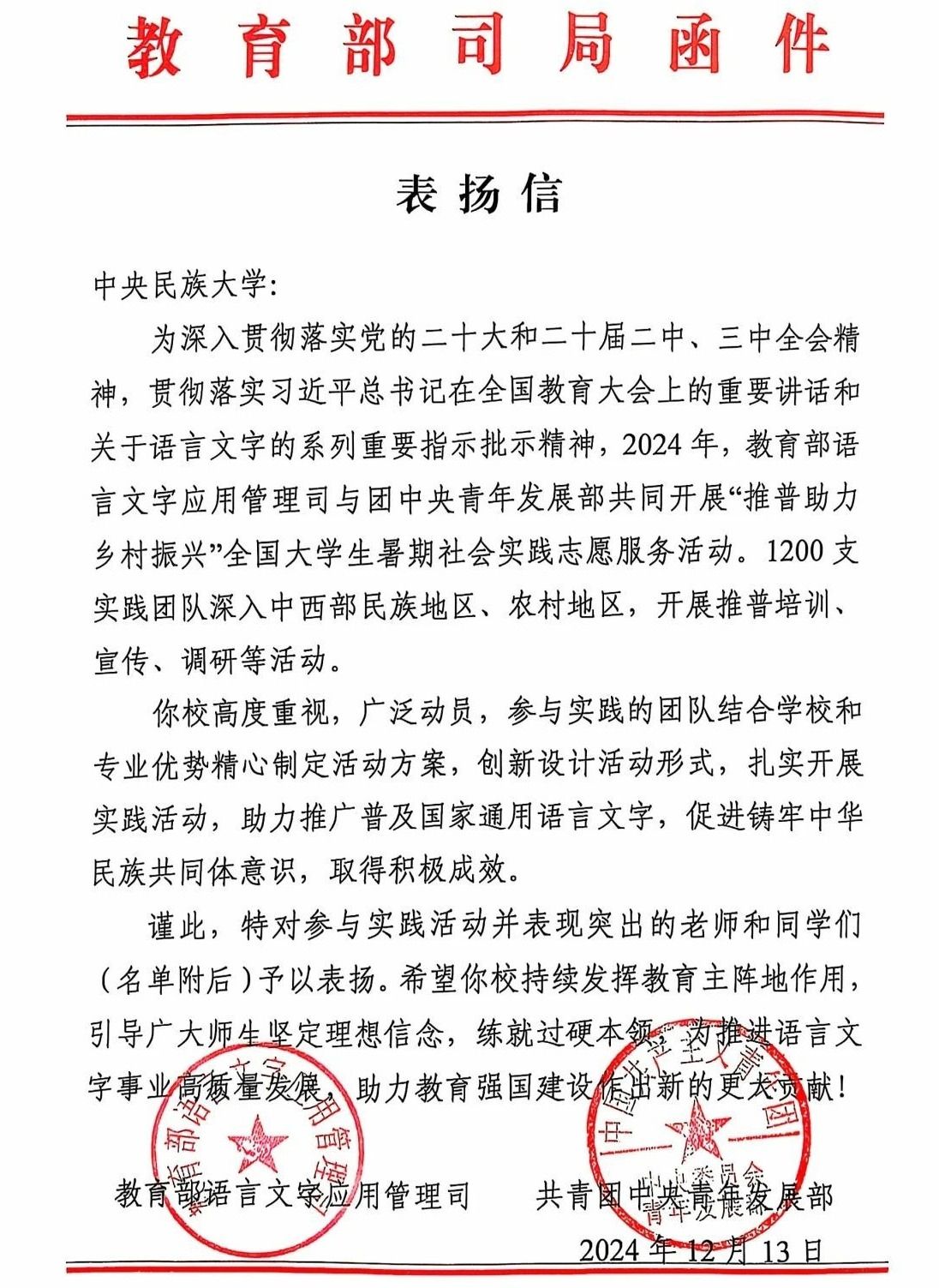 新闻网讯  2024年,民大师生凝心聚力,在“青年服务国家”首都大学生暑期社会实践、“时代新人强国行”首都大学生主题社会实践、“推普助力乡村振兴”全国大学生暑期社会实践志愿服务活动、首都高校师生服务乡村振兴行动计划等各类重大实践活动中斩获集体、团队、项目和个人类别荣誉奖项,其中,学校获得2024年“青年服务国家”首都大学生暑期社会实践先进单位。民大人用行动诠释了“心中有情、脚下有泥、肩上有责”的使命与担当。