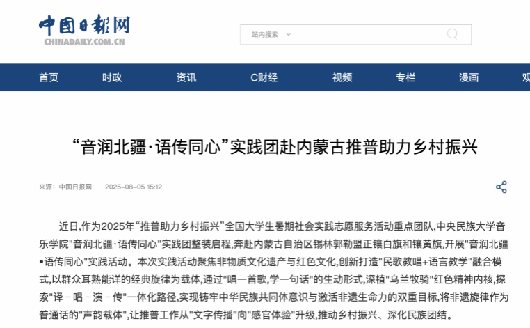 “卖牛羊再也不用比划了!”内蒙古锡林郭勒盟正镶白旗的牧民金花奶奶捧着奶茶,对音乐学院“音润北疆”团队竖起大拇指。这支被中国日报网专题报道的全国大学生暑期社会实践重点团队,带着乐谱下乡的队伍,用“译、创、演、传”四步工作法,将悠扬的《察哈尔八旗》进行普通话改编,既保留了“清雾缭绕山山水水”的草原意境,又让“辽阔草原喷绿吐翠”的歌词更易传唱。当牧民们用新学的普通话跟唱时,古老的民谣遇见新时代的韵律,普通话的节奏为传统曲调注入新的生命力。这一刻,歌声化作语言纽带,一头扎进民族文化的厚土,一头系着草原的深情,一头跃向振兴乡村的旷野,在中华民族共有精神家园的画卷中绵延万里。