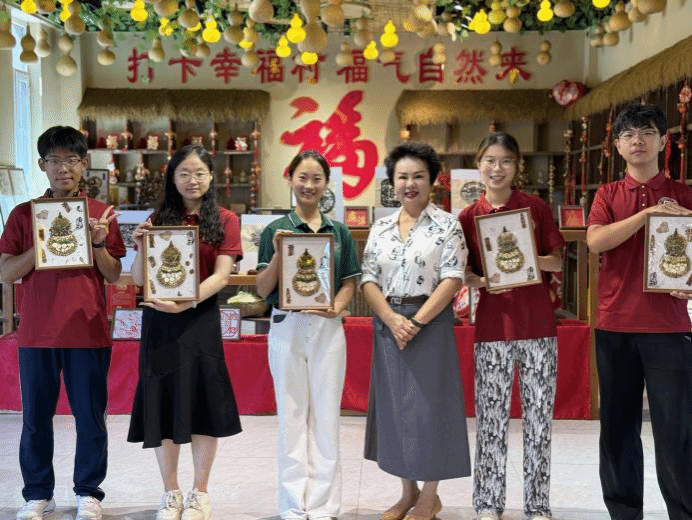 服务队成员在新疆呼图壁县葫芦园体验剪纸、麦秆画等非遗技艺
