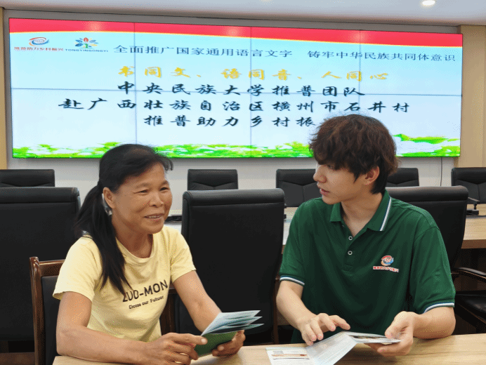 服务队成员在广西横州市石井村开展推普活动,为当地群众讲解推普手册