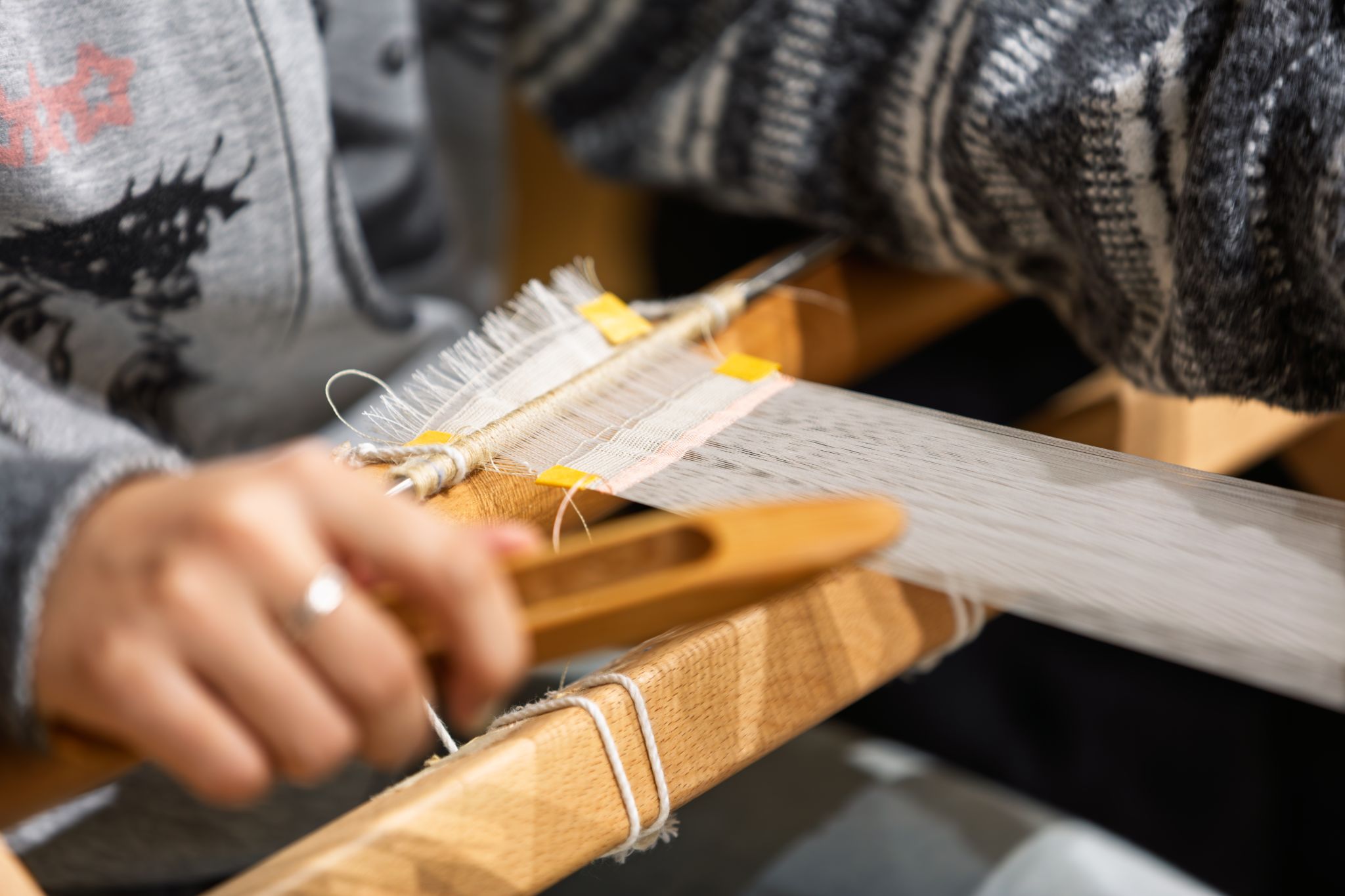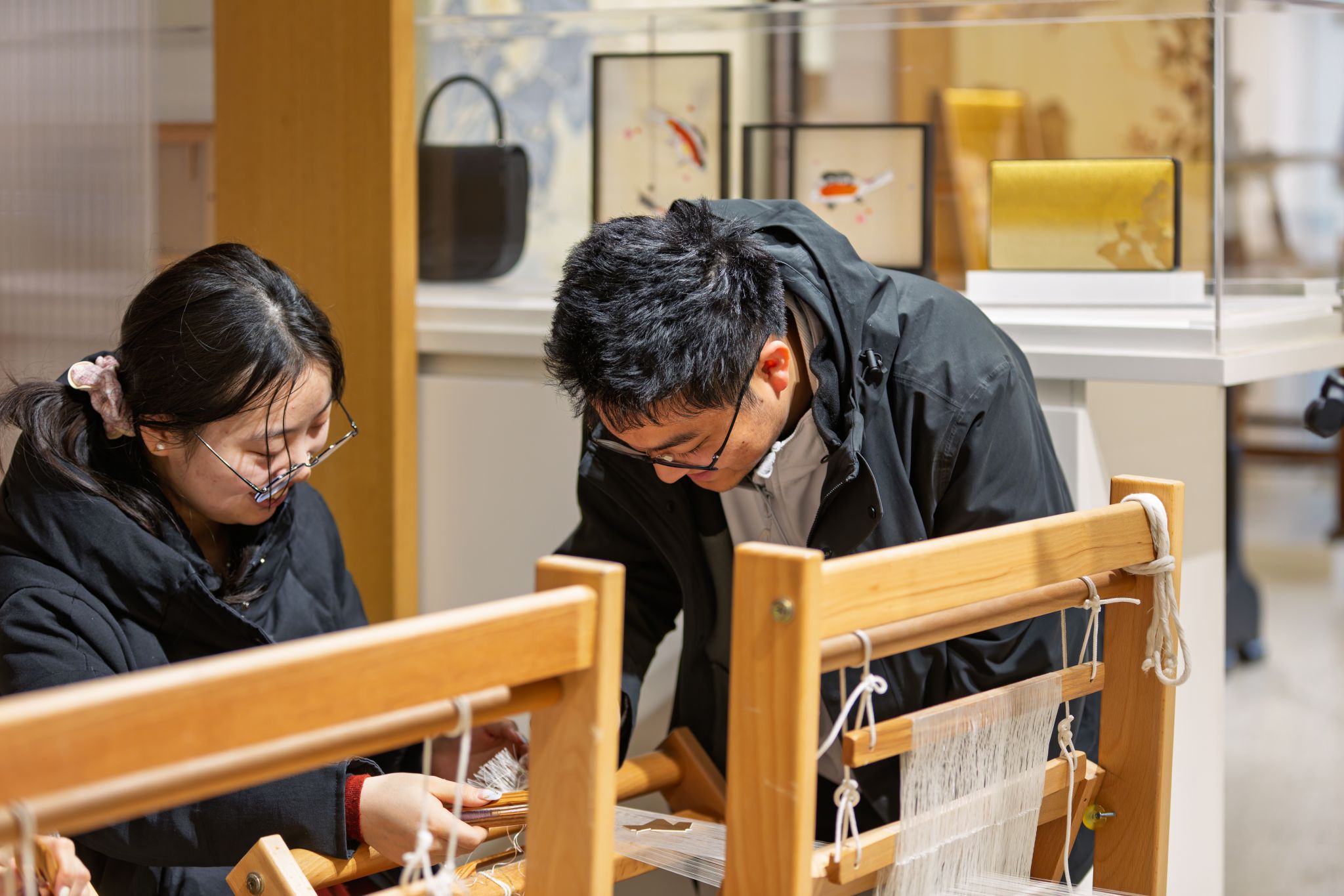 经纬之间见匠心。在祯彩堂工艺社,实践团与苏州缂丝织造技艺市级代表性传承人陈文面对面交流。在匠人手把手的指导下,学生们坐上织机,悉心体会一丝一线如何织就精美灵动的艺术品。