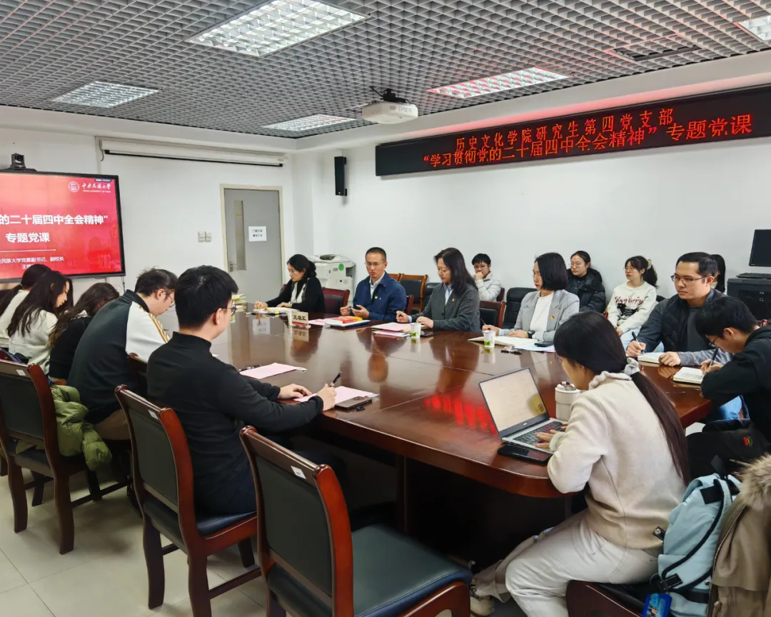 新闻网讯 为深入学习贯彻党的二十届四中全会精神,深刻把握“十五五”时期发展蓝图与使命担当,推动党建与学科深度融合,12月25日,历史文化学院研究生第四党支部举办“学习贯彻党的二十届四中全会”专题党课,校党委副书记、副校长王雄军参加活动并讲授。历史文化学院党委书记王洁、副院长盛肖霞,党委副书记、纪委书记刘昌翠,以及学院学生党支部书记、研究生党支部党员代表共同参加党课学习交流。