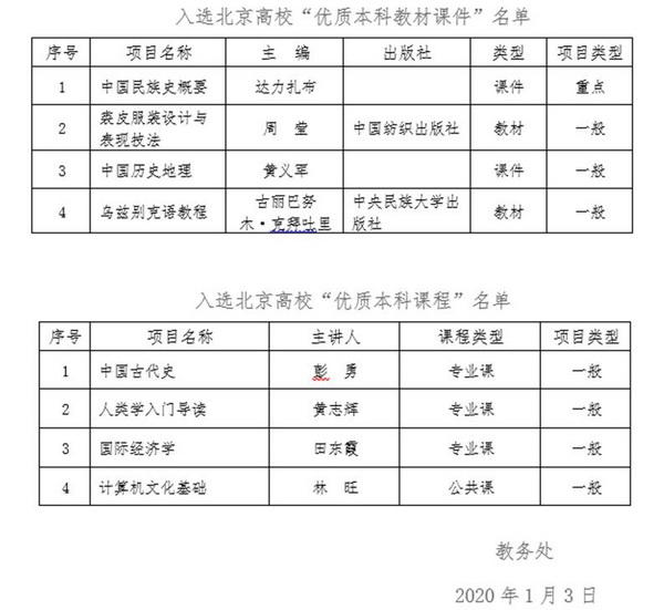 2020年01月06日近日,根据《北京市教育委员会关于公布“优质本科课程”和“优质本科教材课件”遴选结果的通知》(京教函〔2019〕692号)公布的遴选结果,我校8个项目入选北京高校“优质本科课程”和“优质本科教材课件”建设项目。