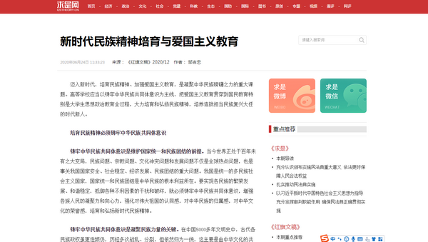 2020年06月25日2020年6月24日,求是网转载我校党委副书记、北京市习近平新时代中国特色社会主义思想研究中心邹吉忠教授刊发在《红旗文稿》杂志2020年第12期《新时代民族精神培育与爱国主义教育》一文。