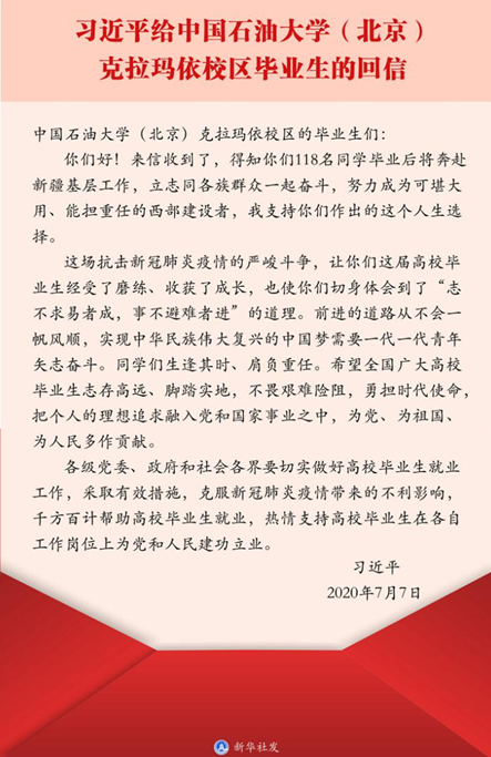 2020年07月10日7月7日,习近平总书记给中国石油大学(北京)克拉玛依校区毕业生回信,肯定他们到边疆基层工作的选择,对广大高校毕业生提出殷切期望。