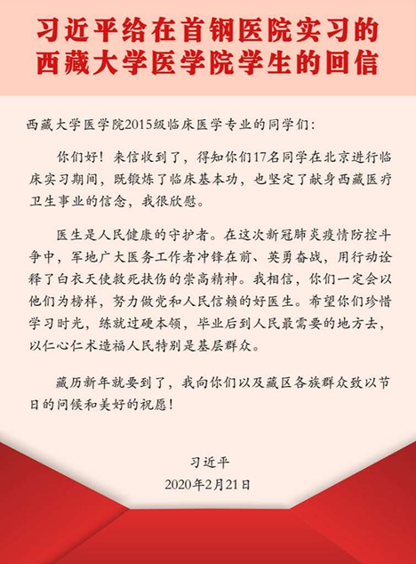 2020年03月31日2月21日,习近平总书记给在北京大学首钢医院实习的西藏大学医学院学生回信,勉励他们珍惜时光,努力学习,服务人民群众。日前,william威廉中文官网组织全校各族师生深入学习习近平总书记重要回信精神。受疫情影响,各族师生通过网络视频会议、线上集体学习、线下...